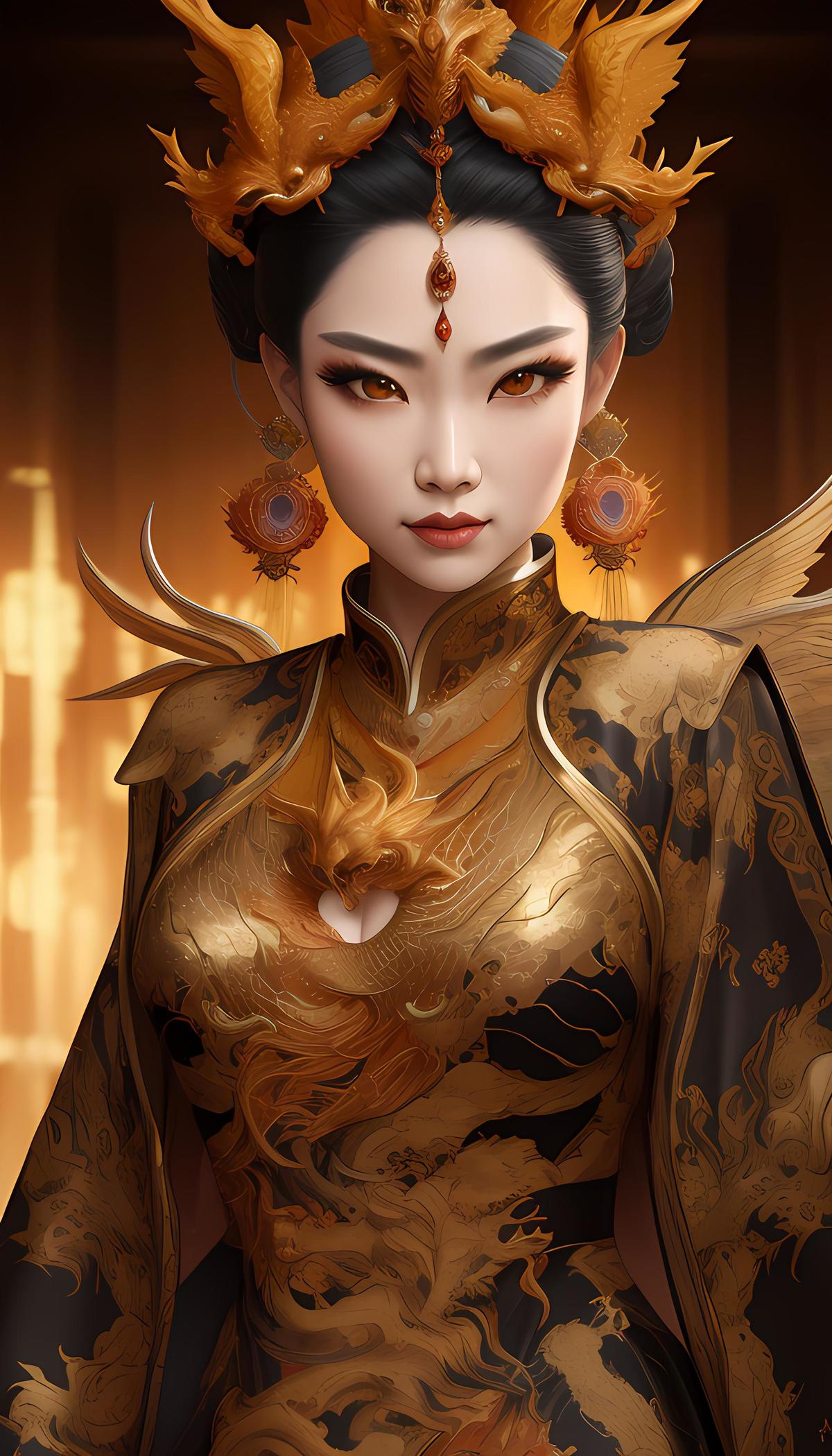 杰作,完美细节,超高精细度,全景,超精细细节,戏剧性的灯光,复杂的细节,女皇,完美东方女性的脸,面部细节刻画,媚眼,妩媚完美身材,中等胸部,黑色头发,龙纹,金黄色龙袍,全身,华丽的凤冠,凤凰缠绕,电影拍摄