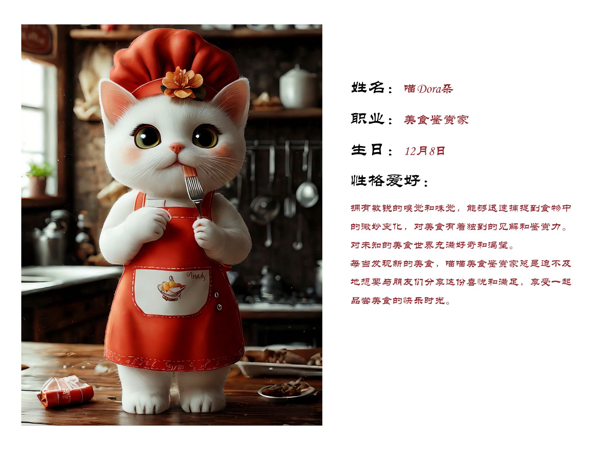 喵Dora朵,一只优雅聪慧的白猫,以其晶莹剔透的大眼睛和常戴的精致厨师帽(帽上点...