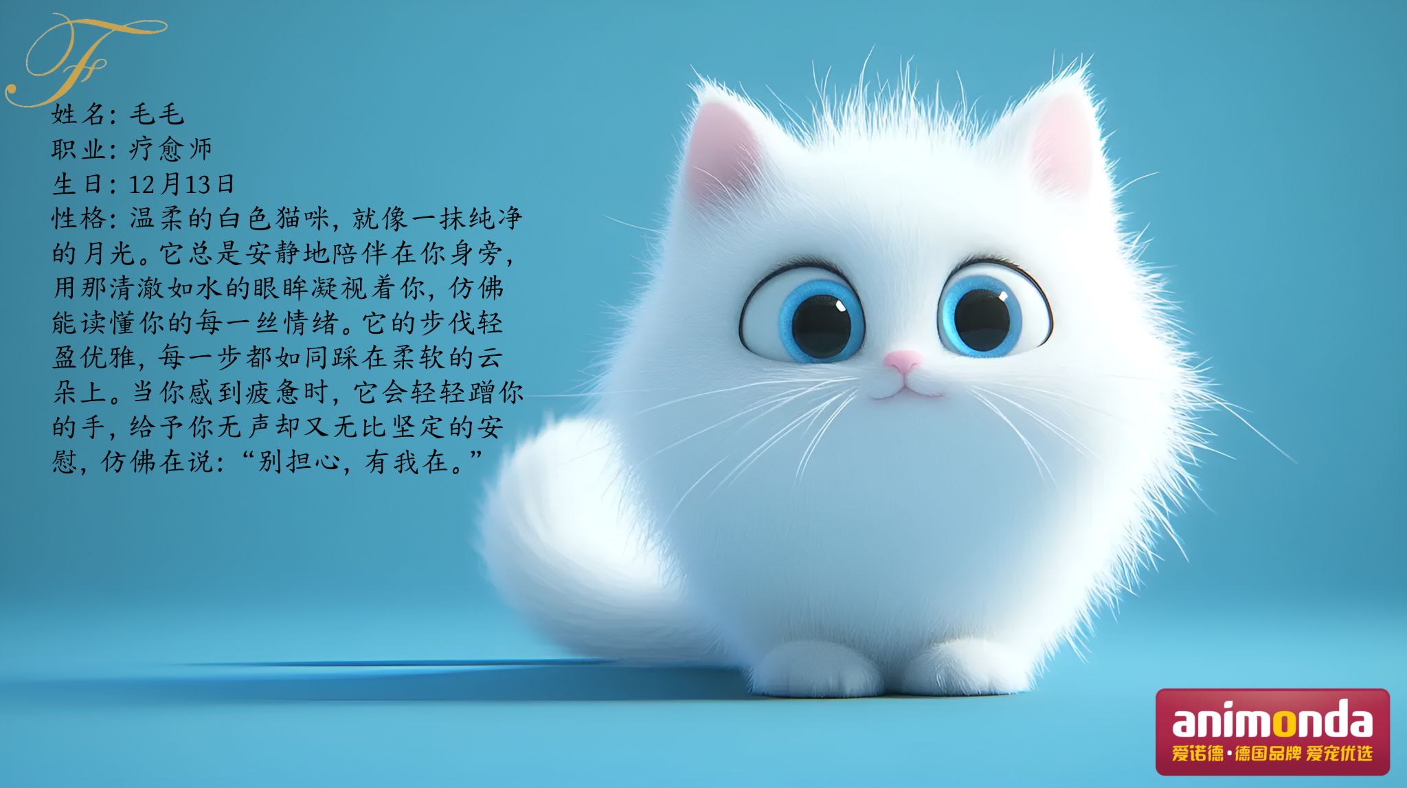 毛毛是一只白色的猫猫,它的毛有点长,软软的,和猫猫一样温柔。毛毛是一位疗愈大师,...