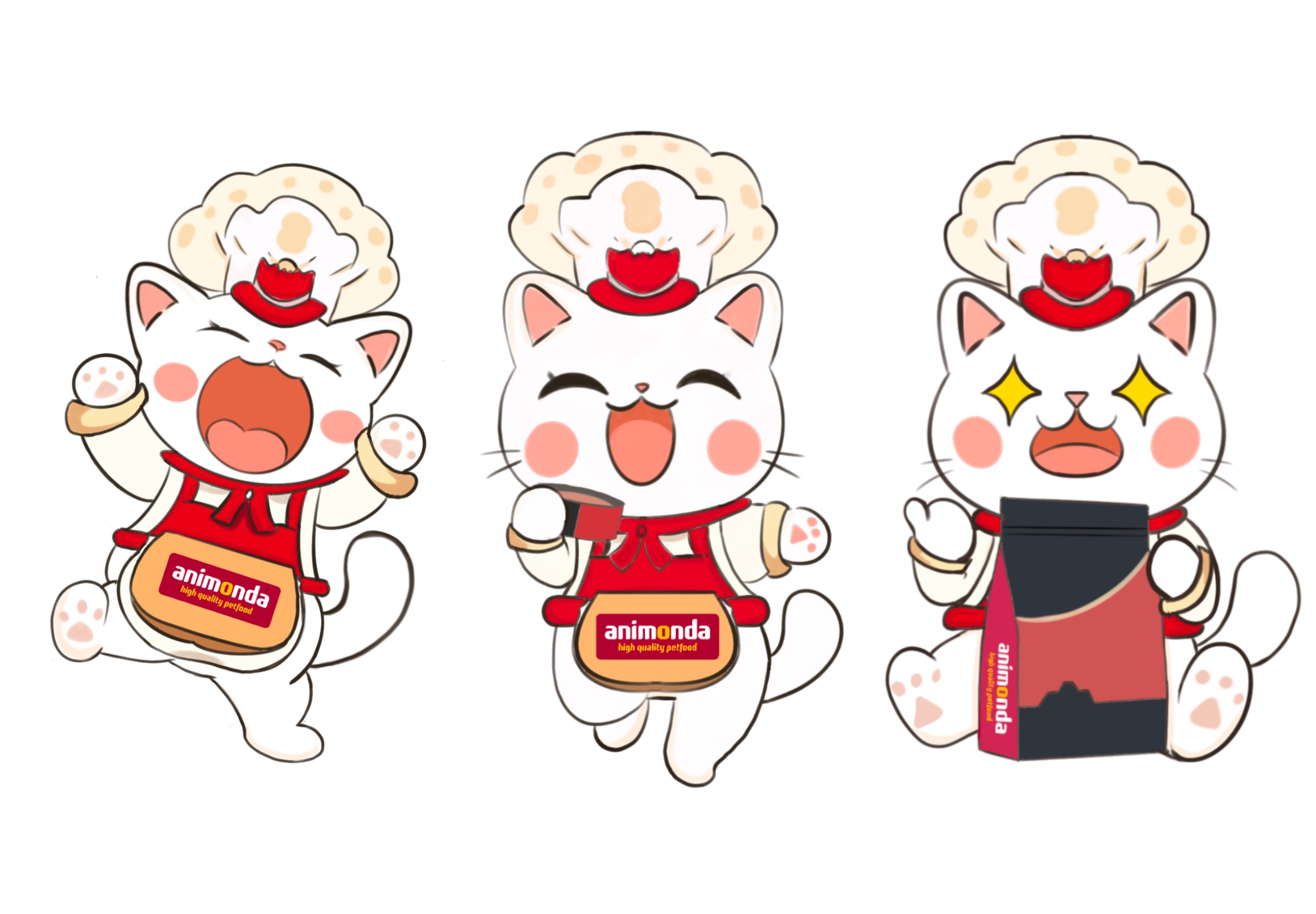 这幅图展示了一个可爱的卡通猫咪形象,它穿着红色的围裙,戴着红色的厨师帽,图中有三...
