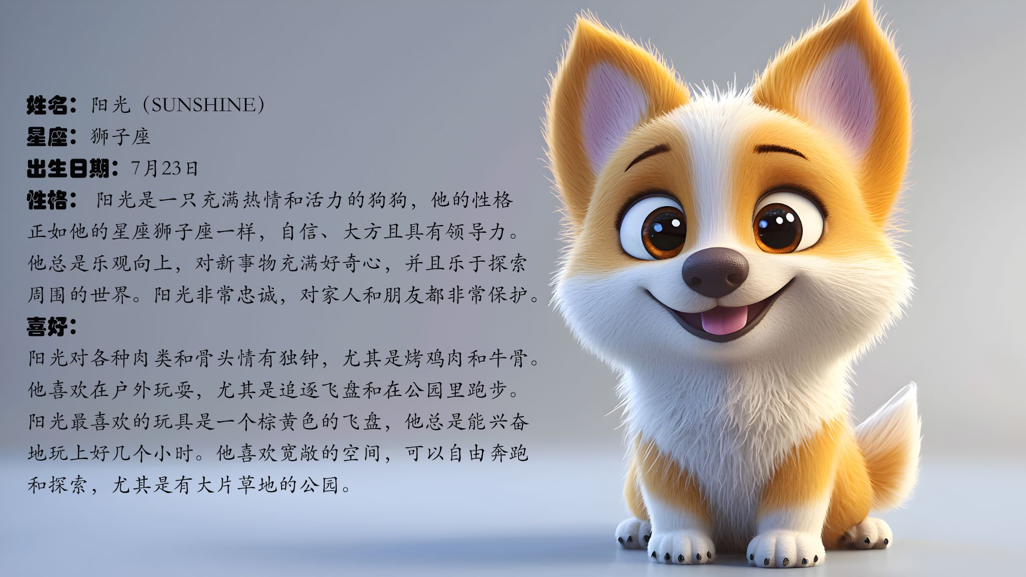 故事背景: 阳光在一个阳光明媚的夏日出生,他的主人在一次户外活动中发现了这只被遗...