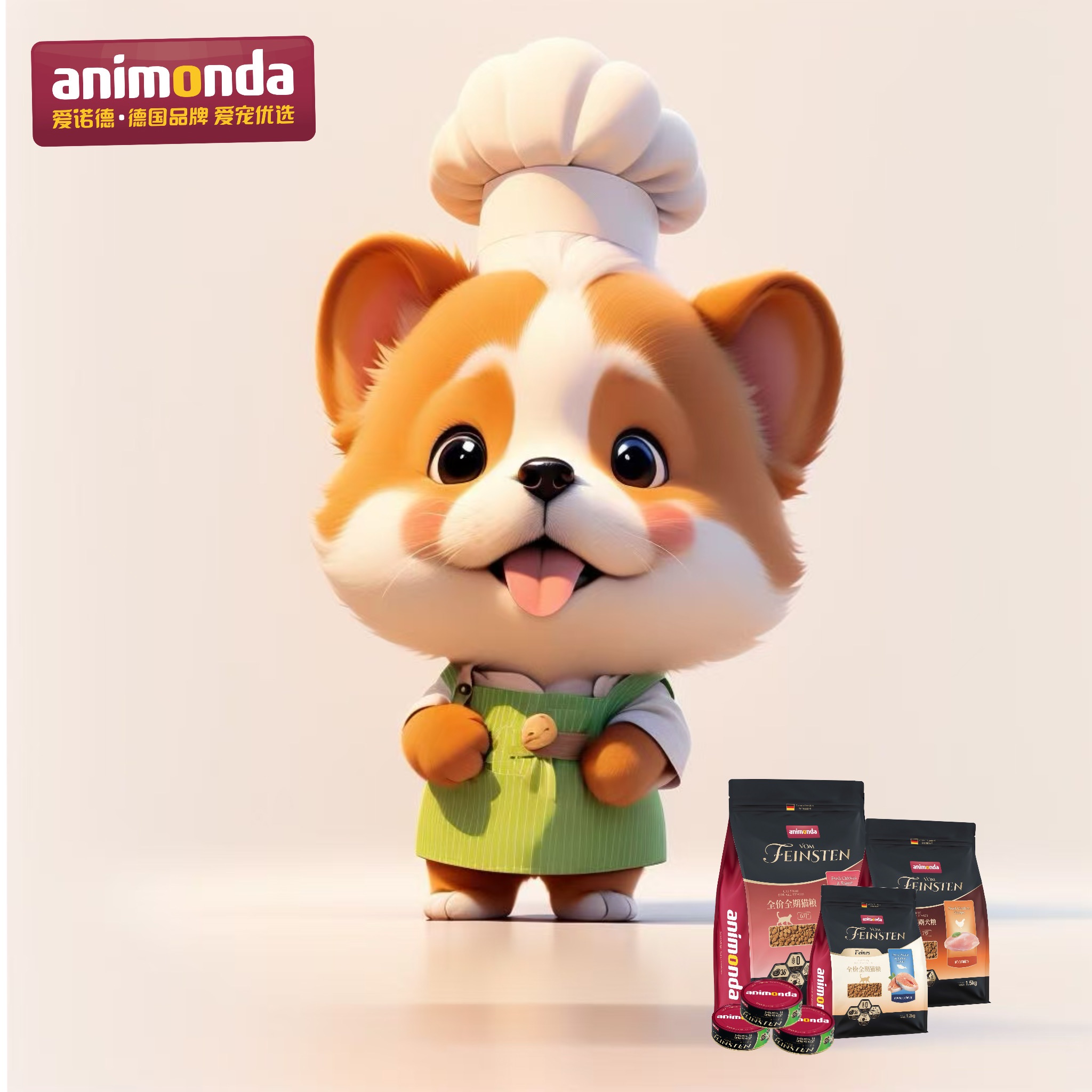 这张图片展示的是德国宠物食品品牌animonda(爱诺德)的宣传形象。画面中央是...