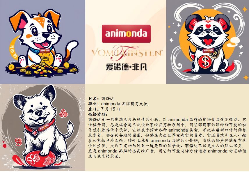 这是两个系列的品牌推荐官: 萌迪是一只活泼可爱的小狗,对 animonda 品牌...
