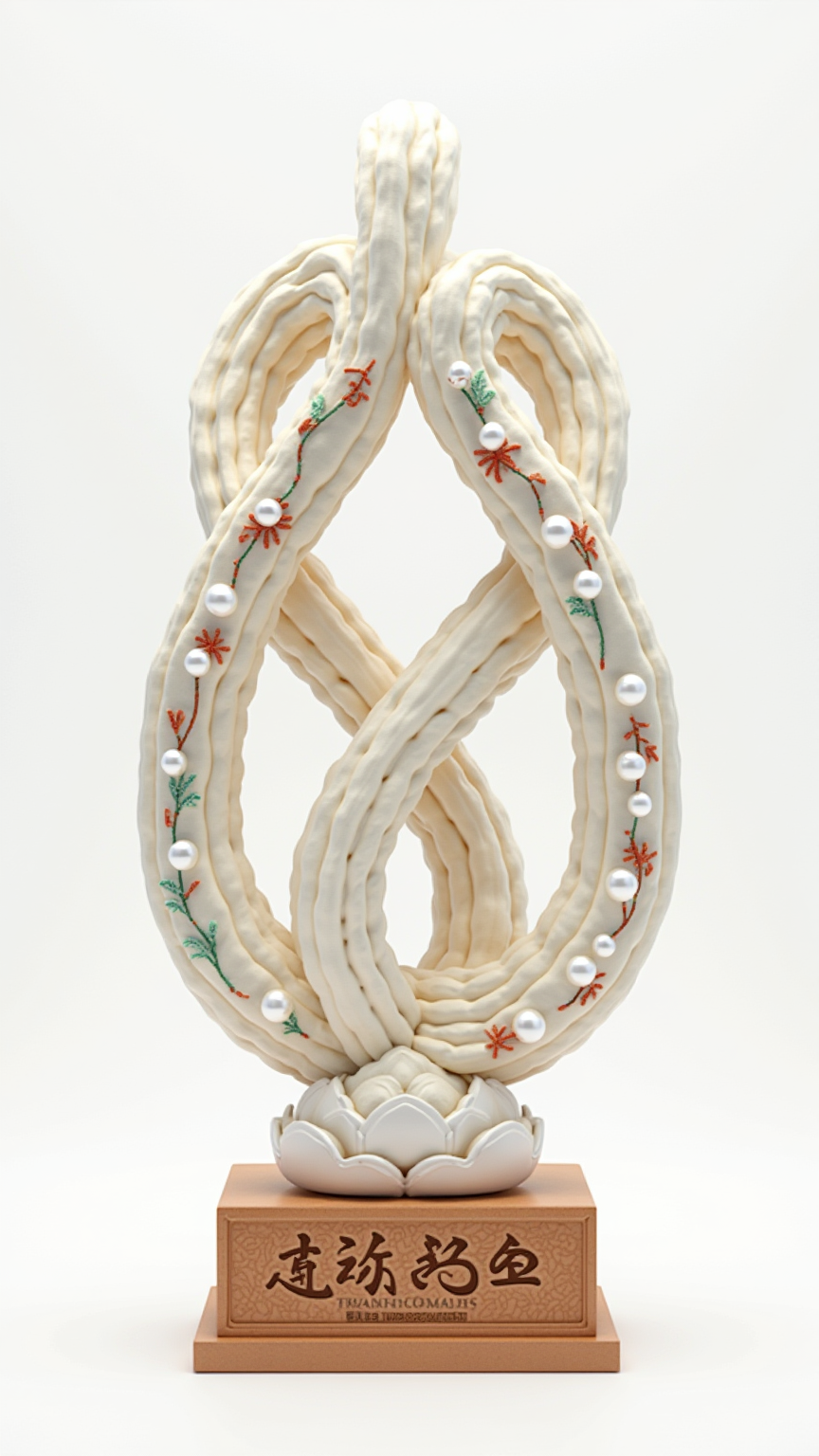 三维数字雕塑,国风风格,核心造型为 “丝路锦结”,整体高 60cm、宽 40cm、厚 20cm,呈对称结状,适配家居摆件与文旅伴手礼场景。主体以浙江丝绸为基底,呈现米白色柔滑质感,表面绣有阿克苏柯尔克孜族刺绣的简化牡丹与葡萄图腾,朱红、翠绿的丝线与丝绸底色形成鲜明色彩对比,纹样线条流畅自然;结体边缘均匀镶嵌 15 颗浙江珍珠,珍珠大小一致、排列整齐,在光线折射下呈现出莹润光泽;底座采用阿克苏维吾尔族木雕工艺,雕刻简化缠枝莲纹样,木质呈现胡杨木的独特肌理,底座正面刻有 “浙阿同源” 篆字,侧面刻 “共创共新” 艺术字样,字体与木雕纹样融合自然。整个雕塑无多余装饰,线条流畅简洁,避免模型生成时出现细节堆砌。色调以米白色、朱红色、翠绿色、珍珠白色为主,背景设置为纯色白底,突出丝绸的柔滑肌理、刺绣的精致纹样与珍珠的莹润光泽