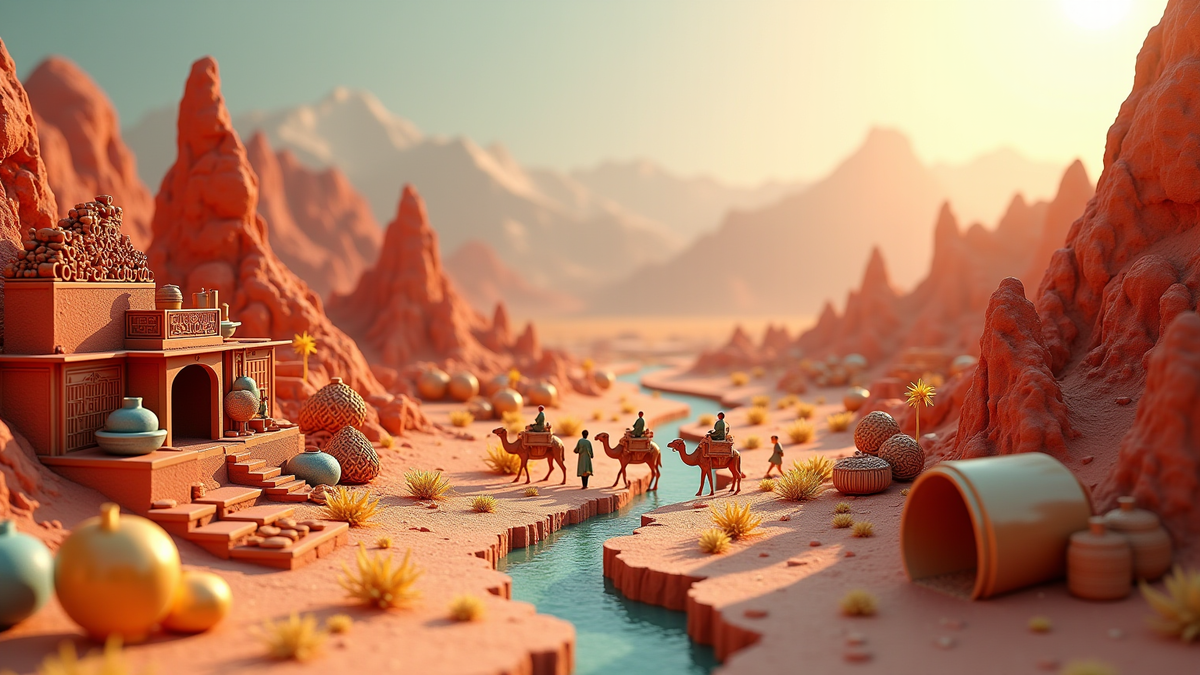 微缩景观宽幅呈现浙阿非遗产业融合。画面以阿克苏红石林褐红、暖金为主色调,点缀浙江...查看更多