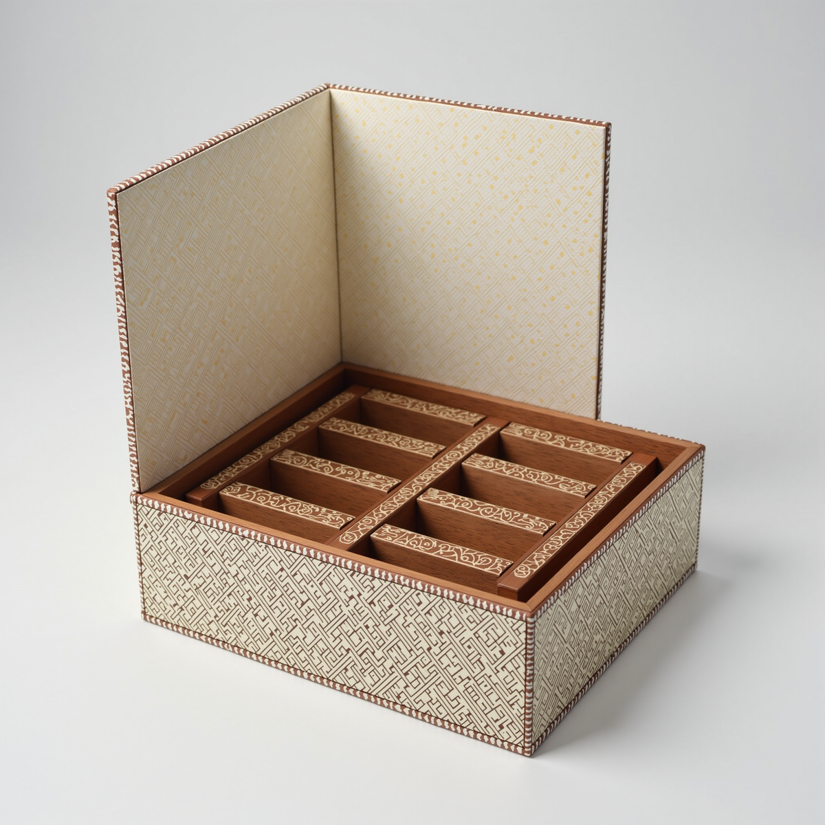 2. 礼盒开合处与内部隔断采用阿克苏核桃木雕刻,雕刻纹样为“浙阿共生纹”——以浙江青瓷的“流水纹”与阿克苏建筑的“几何回纹”交织,隔断设计为可拆卸的模块化结构,可自由组合成首饰盒、文具收纳盒等。