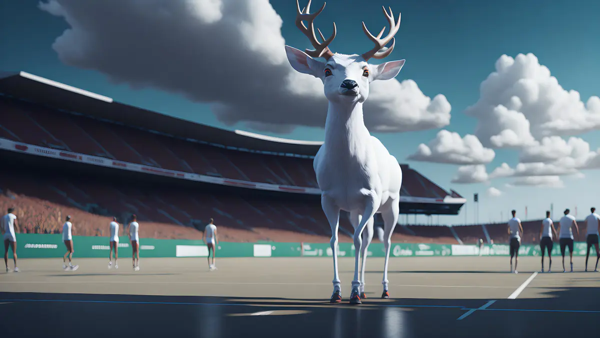 穿着运动服的白鹿,运动员,torch,Olympic,运动会,五彩光,((运动场)),观众欢呼,皮克斯,壁纸,简单,动物拟人,白天,32k,白鸽,(((白云))),(((朝霞))))