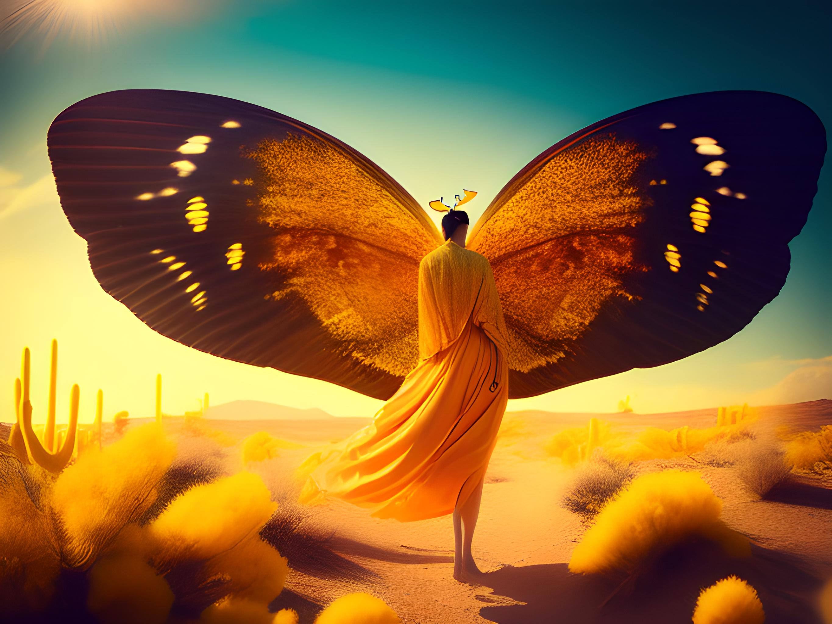 (dali),1女孩,海滩,bug,蝴蝶,云,多云的天空,天,衣服,花,脚印,拿着花,地平线,海洋,橙色的天空,户外,沙子,贝壳,阴影,贝壳,海岸,天空,独奏,海星,日落,暮光之城,水,波浪,黄色蝴蝶,黄色连衣裙,黄色天空,流动,时间,虚无,沙漠,达利,天使,许多蝴蝶精灵在森林飞舞,可爱,灵气逼人,亲切,灵活,飞舞,蝴蝶翅膀,周身散发柔光,夜晚,星星,森林,大师作品,最好画质,更高质量,超高分辨率,高细节,全景,桃红色,面具