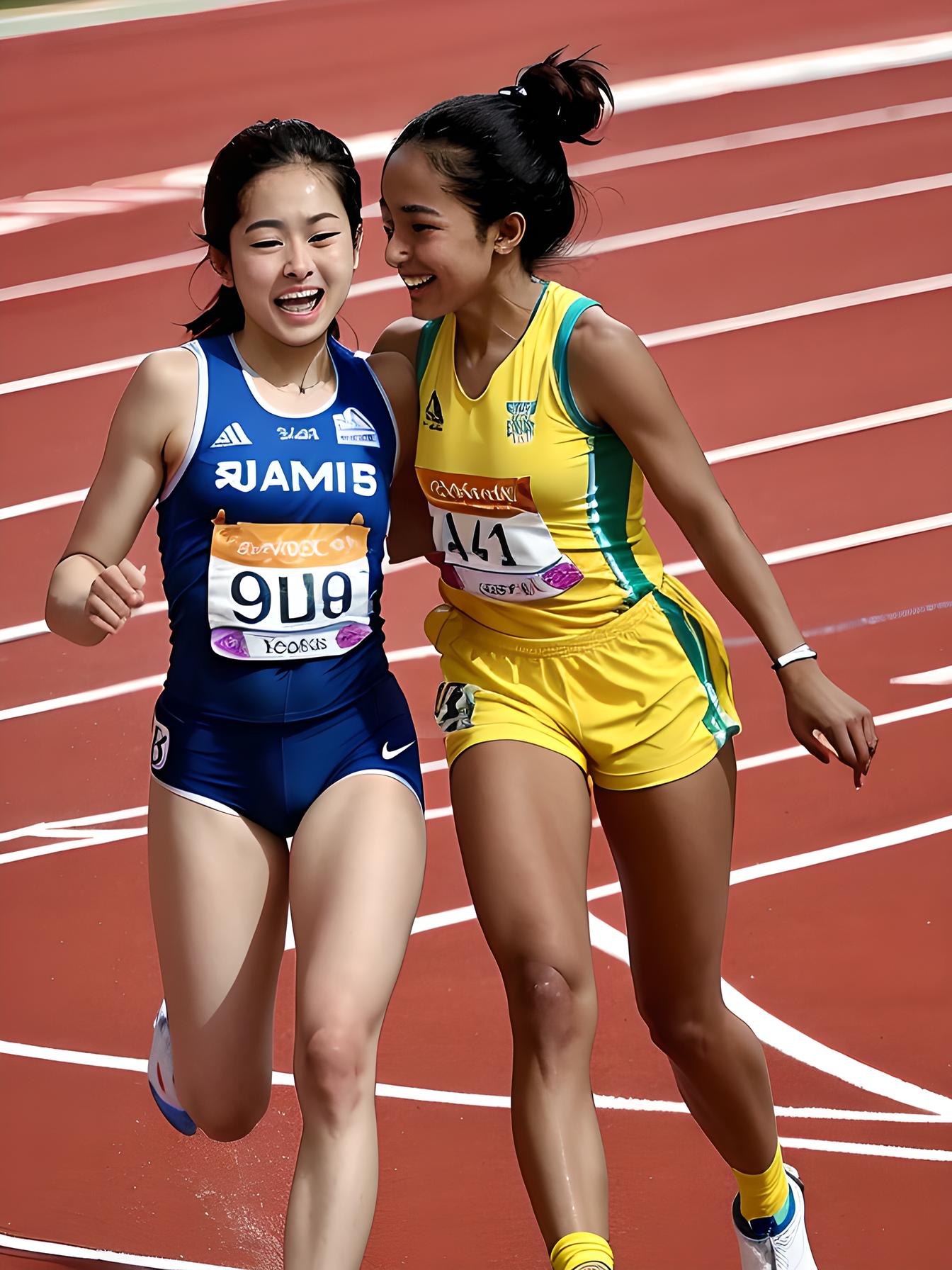 动漫风格,在亚运会跑道上,一位侧身站着的黄皮肤女短跑运动员正伸手扶起另一位摔倒的棕色皮肤女运动员,两人都身着运动员服装,脸上露出感激的表情