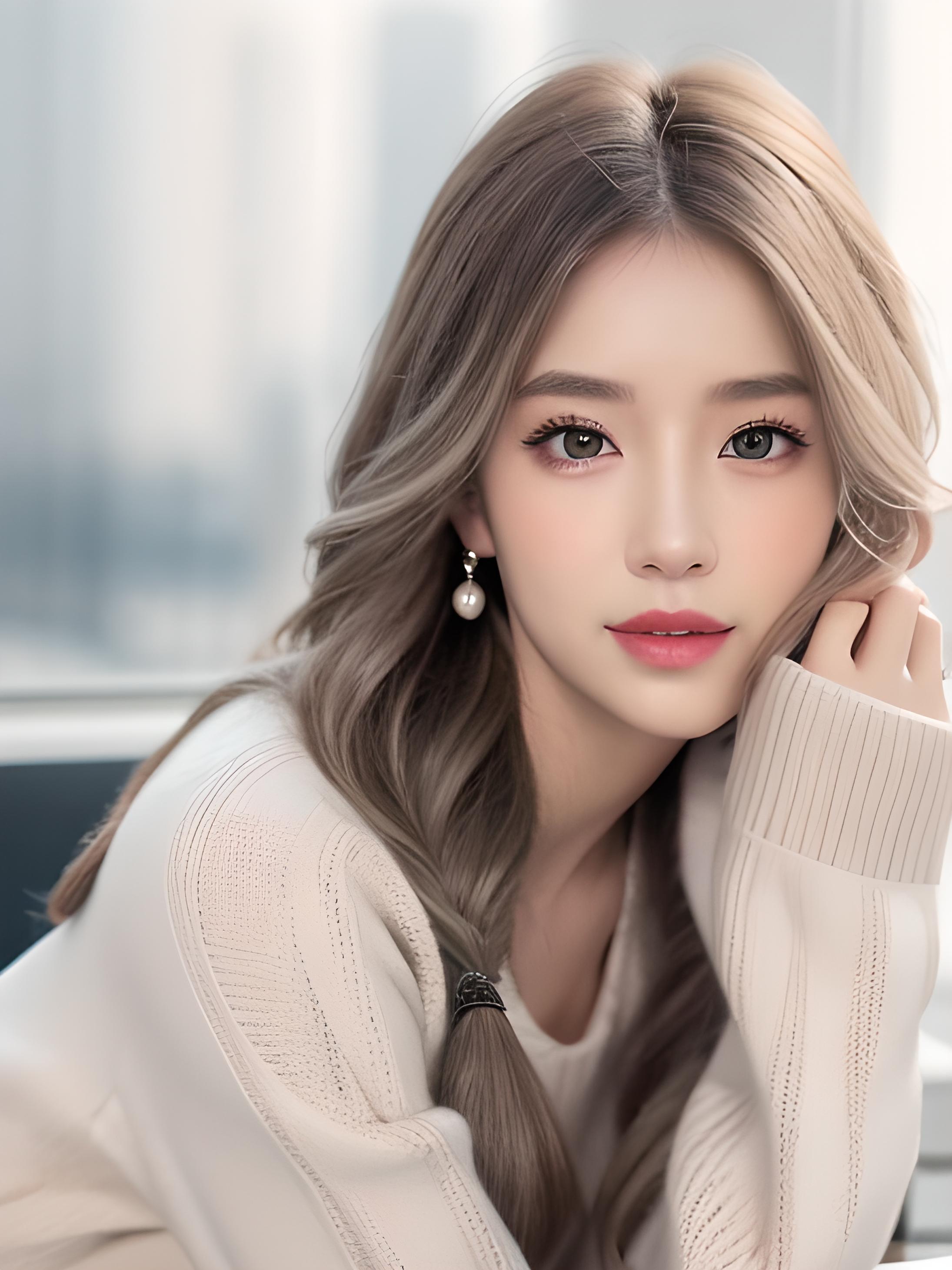 大师作品,最好画质,8k分辨率,近景,迷人、粉彩画、绞花针织毛衣、打底裤、女士、高挑、苗条、瓜子脸、棕褐色皮肤、银发、粉色眼睛、宽鼻子、撅嘴、尖下巴、齐肩发、粗发、波浪分层波波头、吊式耳环、柔和的粉红色透明唇膏、在城市锻炼环境中锻炼肌肉