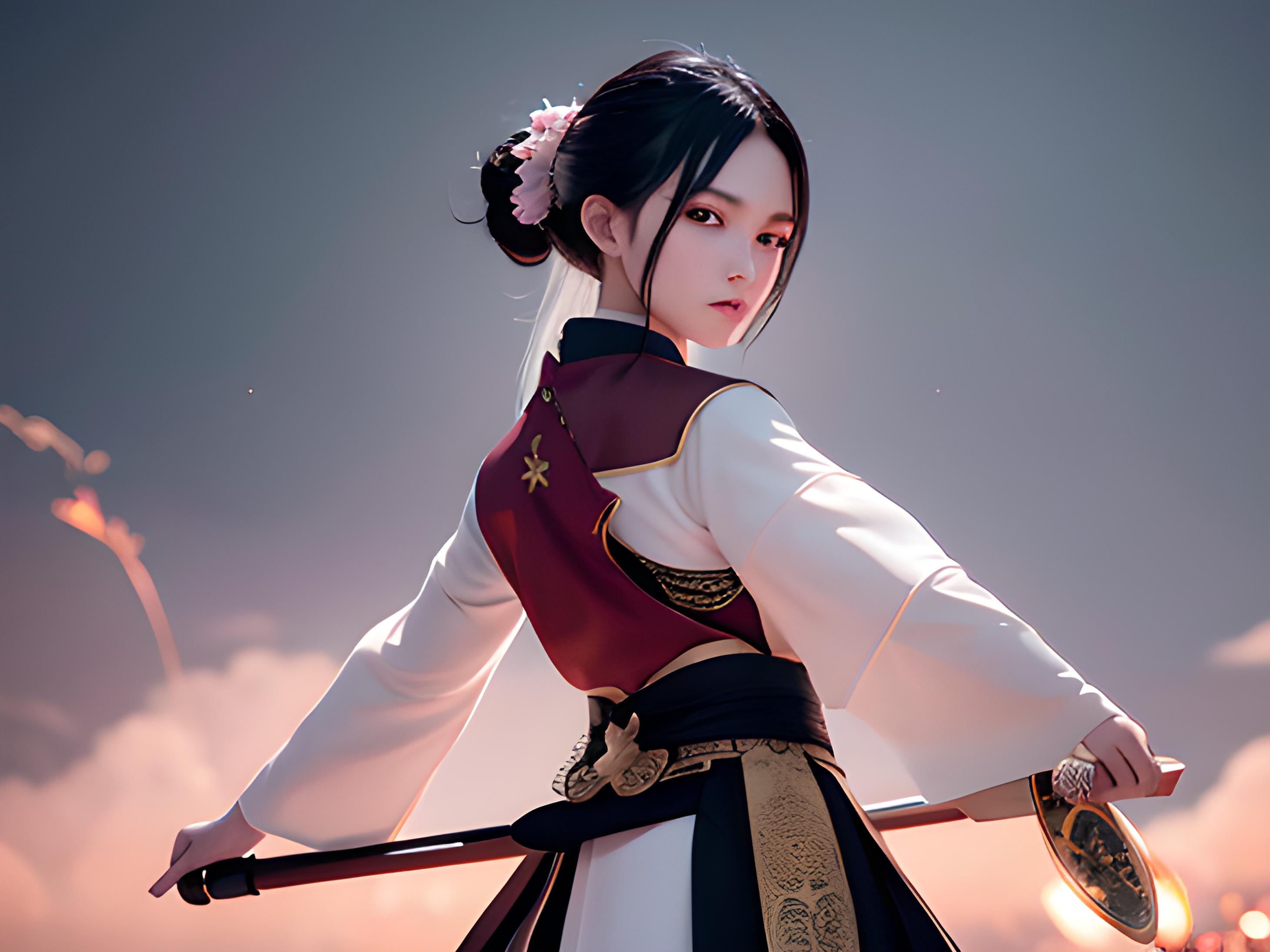 大师作品,最好画质,Octane渲染,大师作品、最好画质、Corona渲染、武侠、女人、完美脸庞、黑发、穿着传统中国汉服、太极,桂林,远处的粉红荷花,头像
