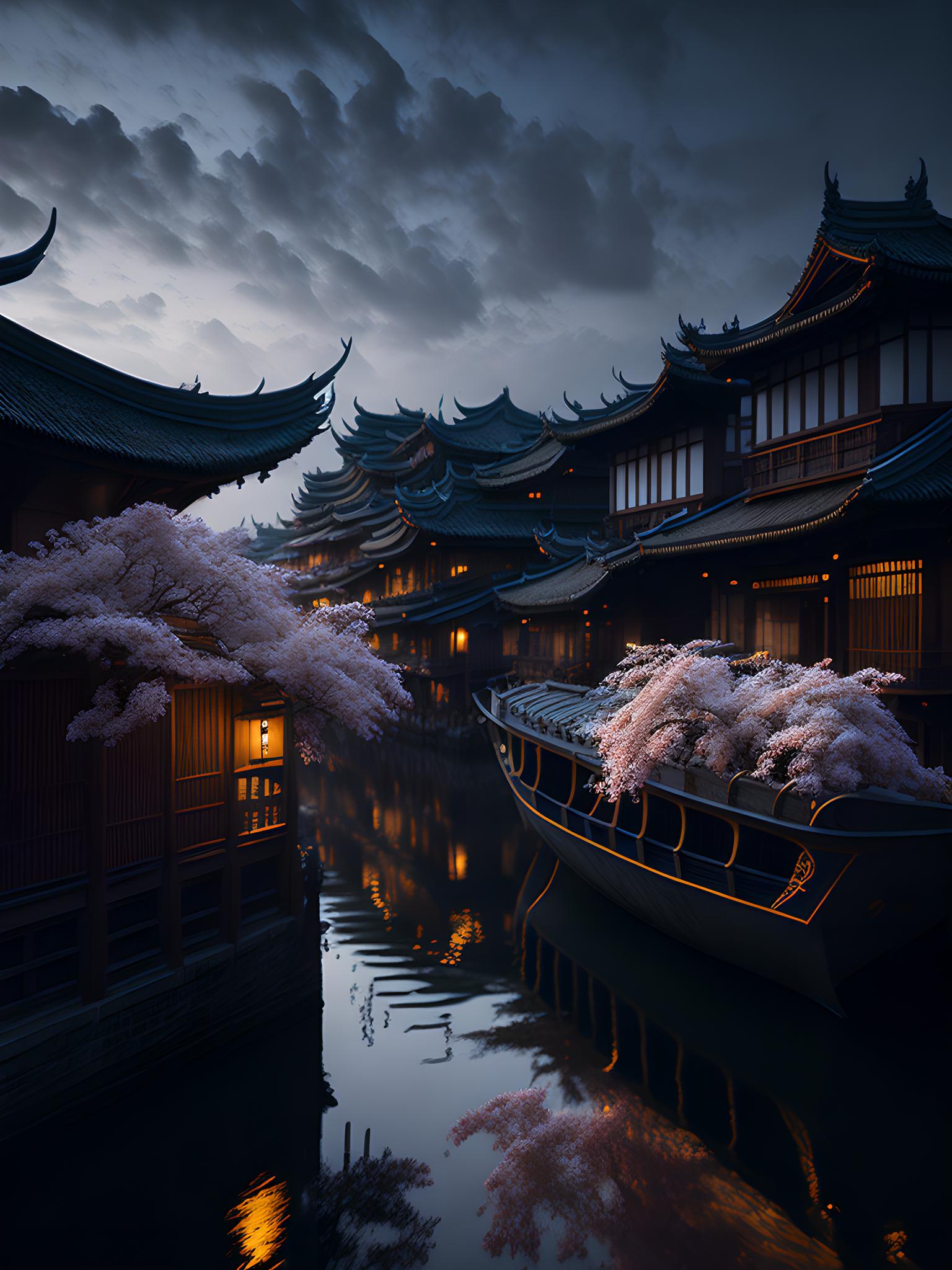 描述江南小镇秋季夜色,通用模型,写实插画,超精致,景深,明亮,ar3:4
