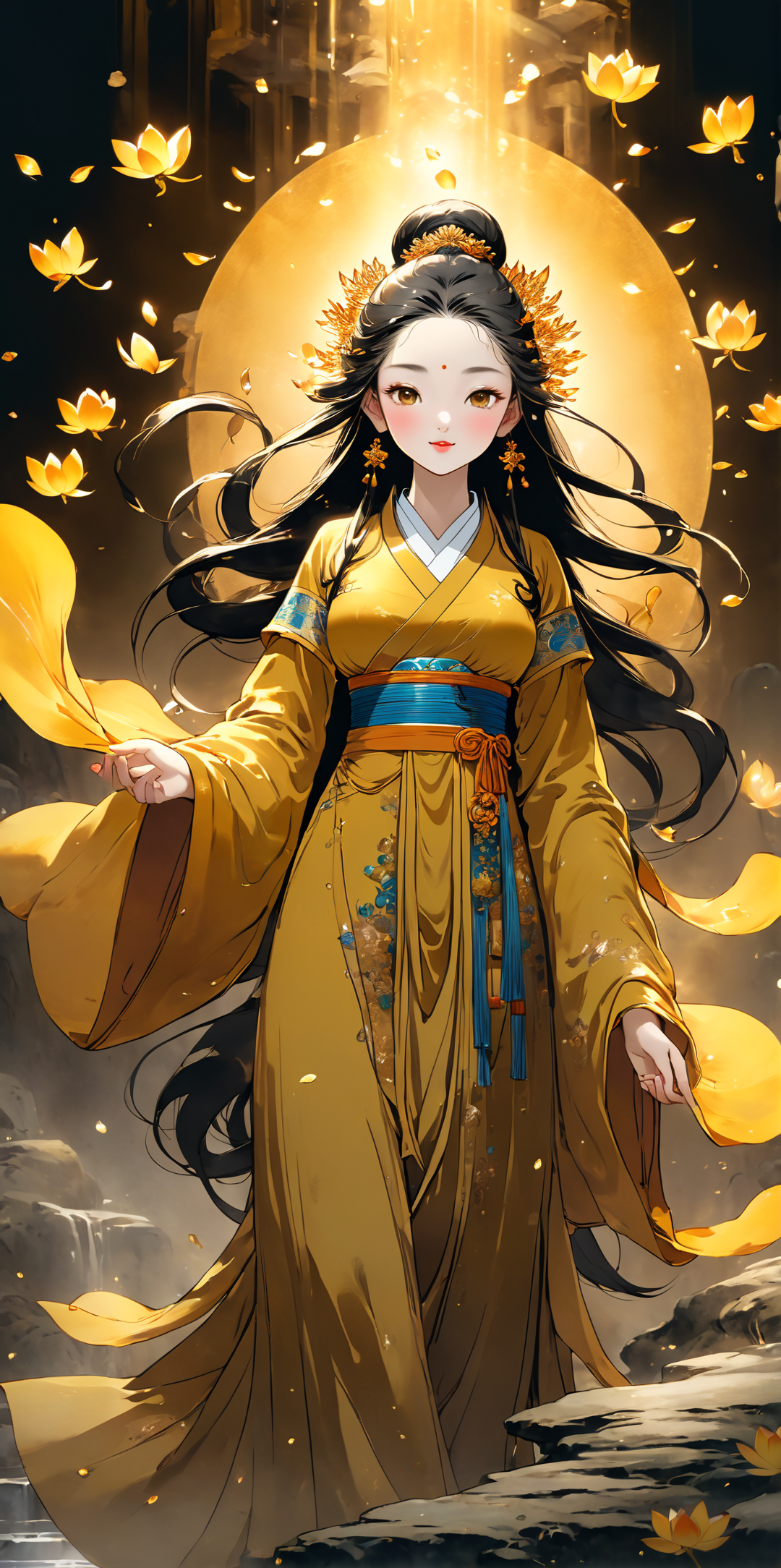 最高画质,杰作,精美的CG,水晶,金色荷花拟人,精致美丽的脸,美丽的眼睛,水彩、泼墨、中国画、褐色水晶眼睛、古装长发、长裙、古装服装、精致复杂的荷花发饰,破碎的玻璃、水晶矿、金色荷花、金色花瓣、高光,凋零飘落的花瓣,画面丰富、绝美的,迷人的,完美,梦幻修饰、超清,高清、8k,双手合十