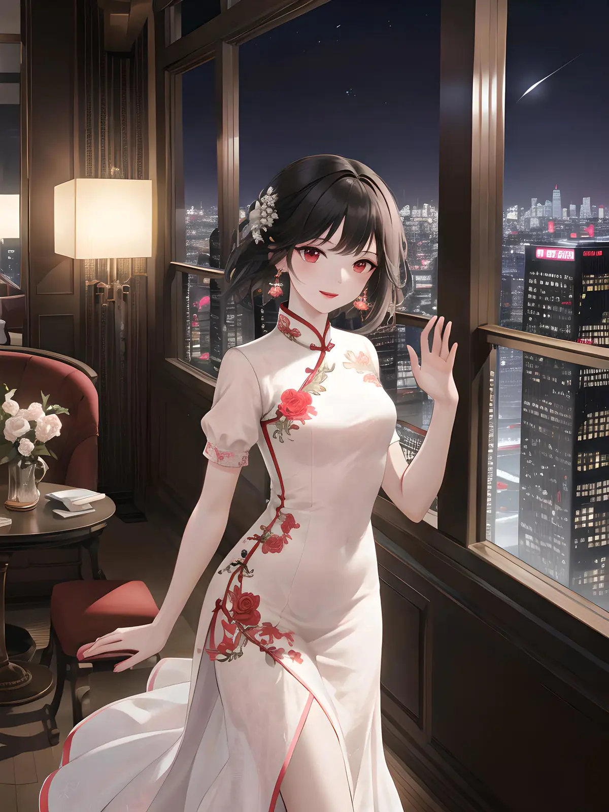 indoors, hotel, night, moonlight, cityscape, skyscrapers background, dynamic pose, dynamic angle,