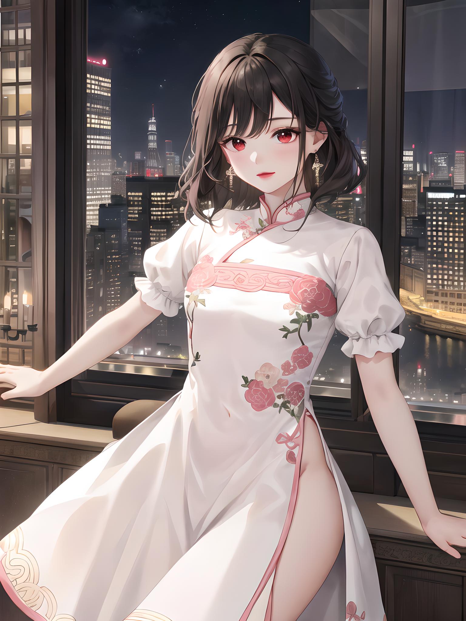 1 girl, black hair, bangs, red eyes, light pink lipstick, red earrings, qipao dress, white dress, short sleeves, flower embroideries,