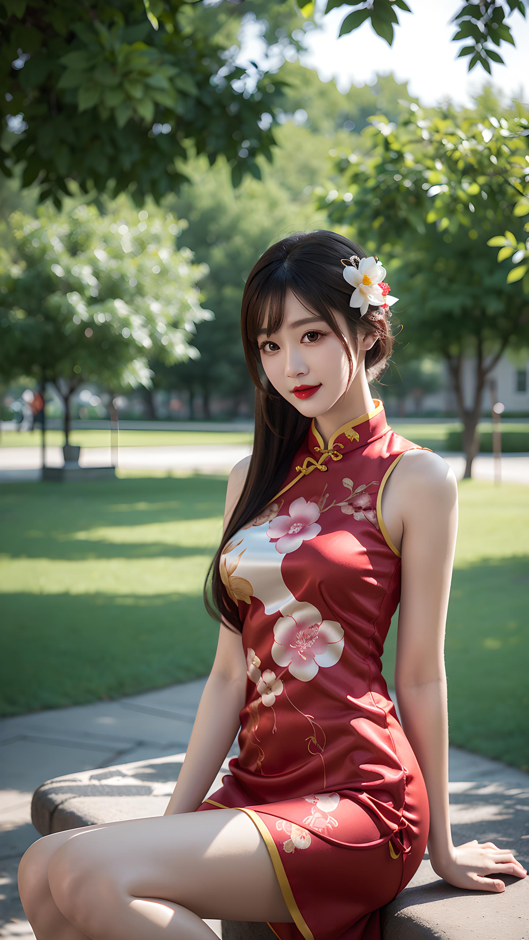 美女 微笑 侧坐在公园椅子 纸扇遮面 旗袍 古典发饰 红唇 婀娜身姿 绿树成荫