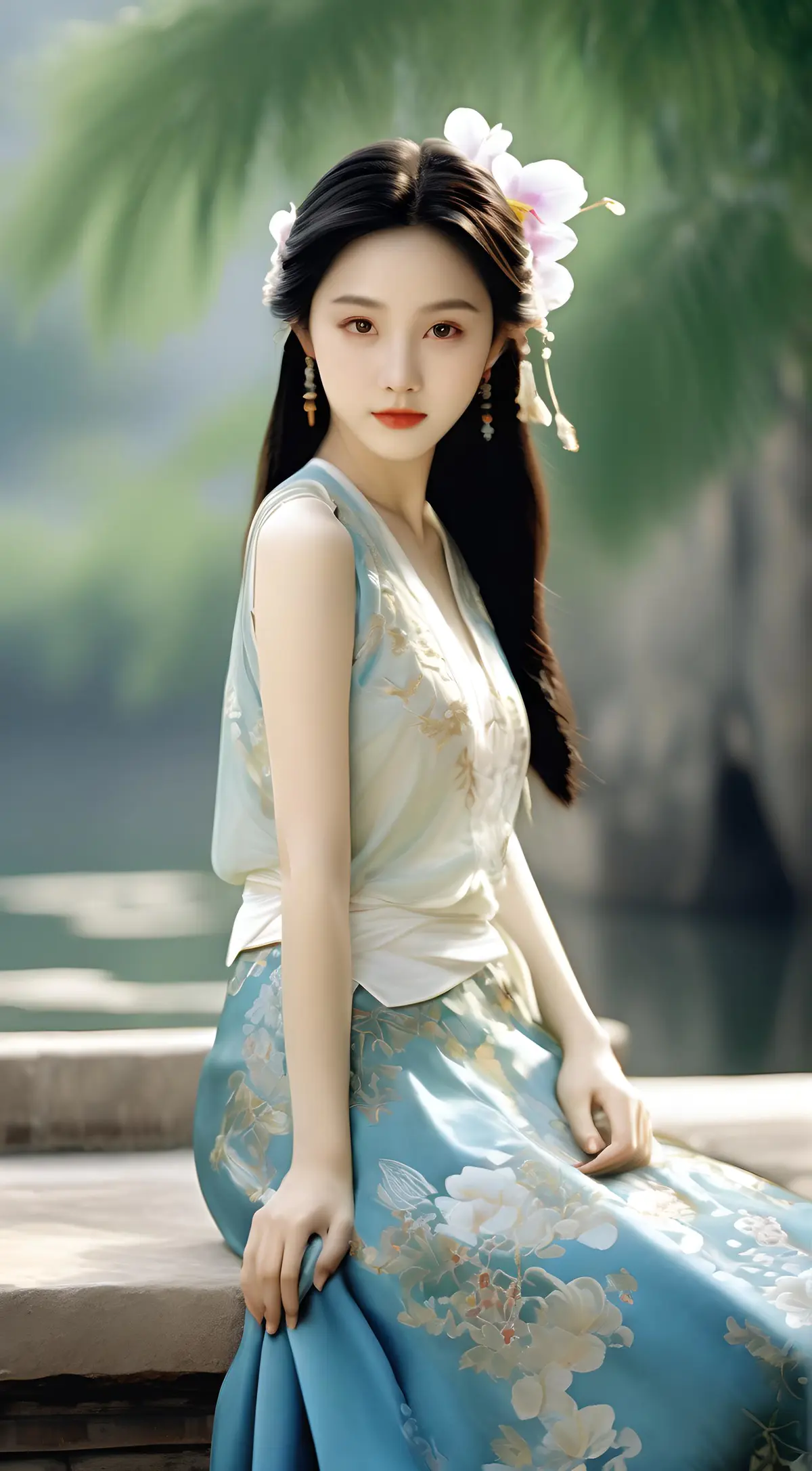 柔美、阳光、温柔的写实风格,美丽亚洲女人,穿着淡蓝色的长裙子,裙子上有兰花手绘图案,中国古代的仙女型,白肤如雪,精致的脸蛋,明亮的大眼睛,甜美的笑容,精致的长发,白色的背景,江南水乡,清新自然,唯美诗意,高清...查看更多