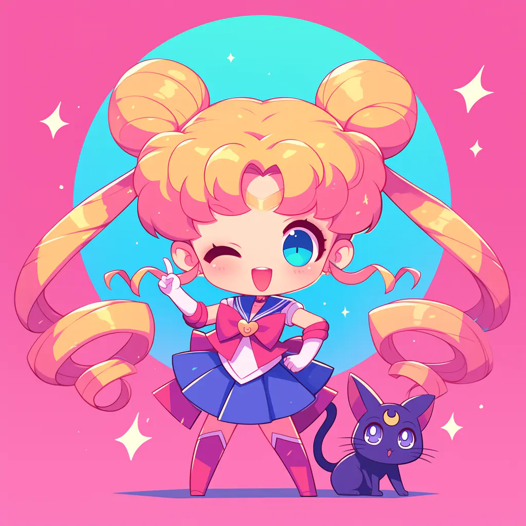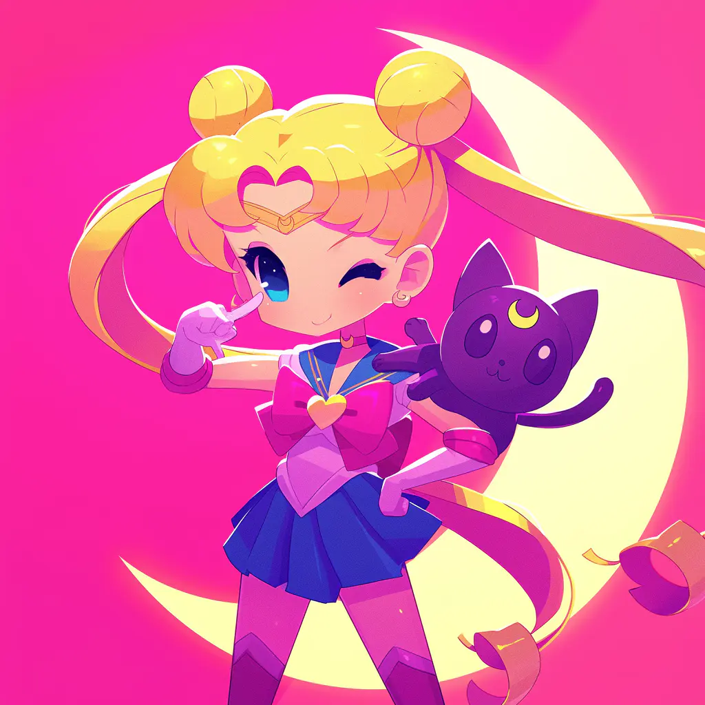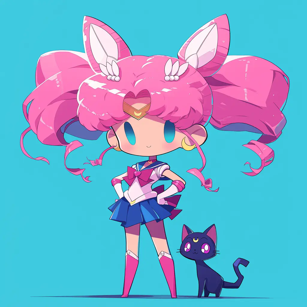 sailormoon with her luna cat, blocky,pink style, pop kei, official art, tondo, 2d, chibi, cartoonish designs