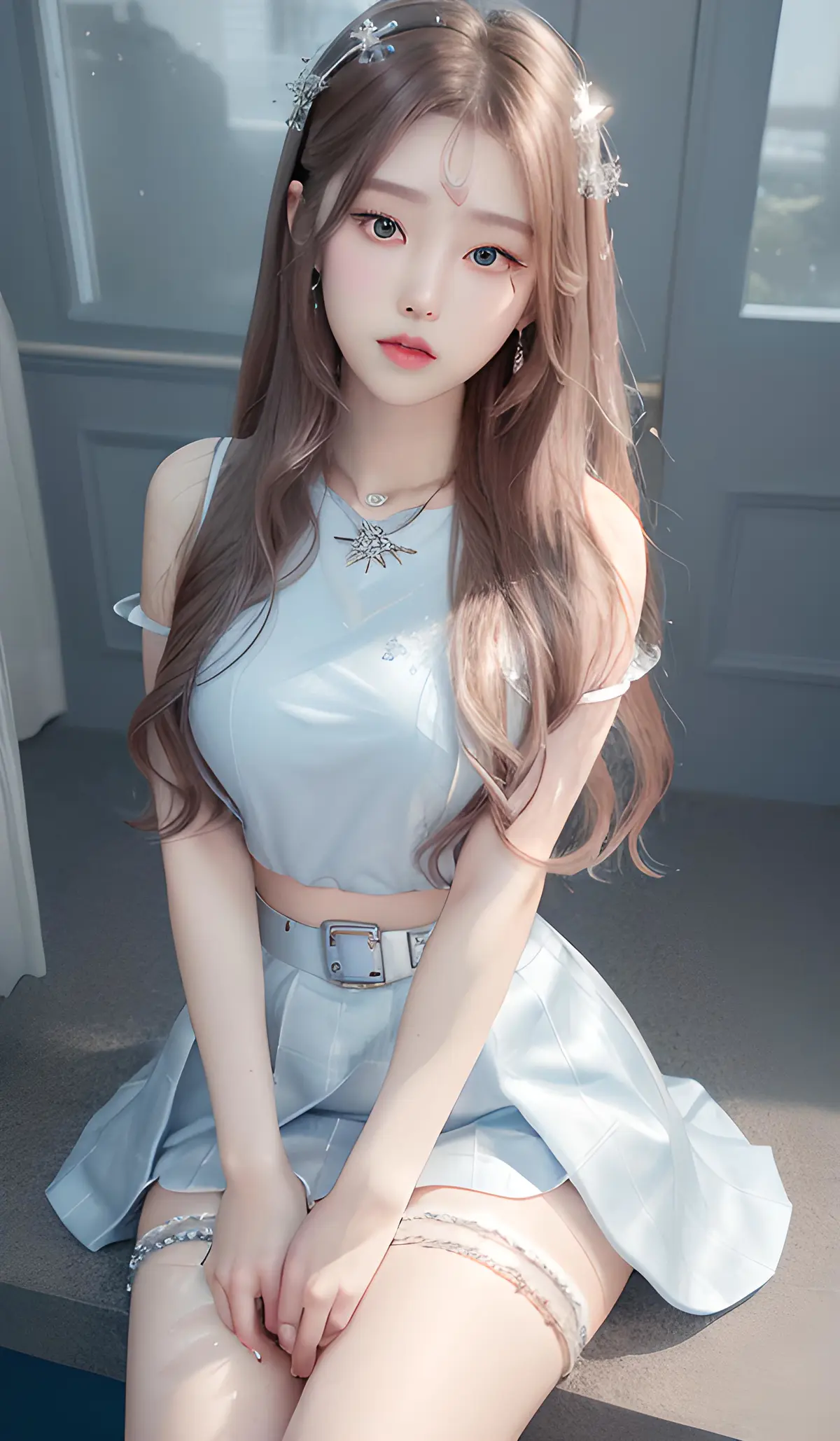 最高品质,杰作,高清,大师杰作,极致细节,电影级光线,女孩,浅蓝色的眼睛精致,项链,银白色卷发,蓝色格子带领衬衫,腰带,裙子,短裙,紧身裙,梨花发饰,发饰精美,星星耳钉,蓝色手链,领带,水雾,星空,水滴,破碎的感觉,玻璃,精致的五官,五官精细刻画,精致的头发,精致的眼睛,8k画质,CG渲染,笔直长腿,完美胸部,极致身材,银白色项链,坐着,手臂自然下垂,全身照,黑丝丝袜,白色高跟鞋