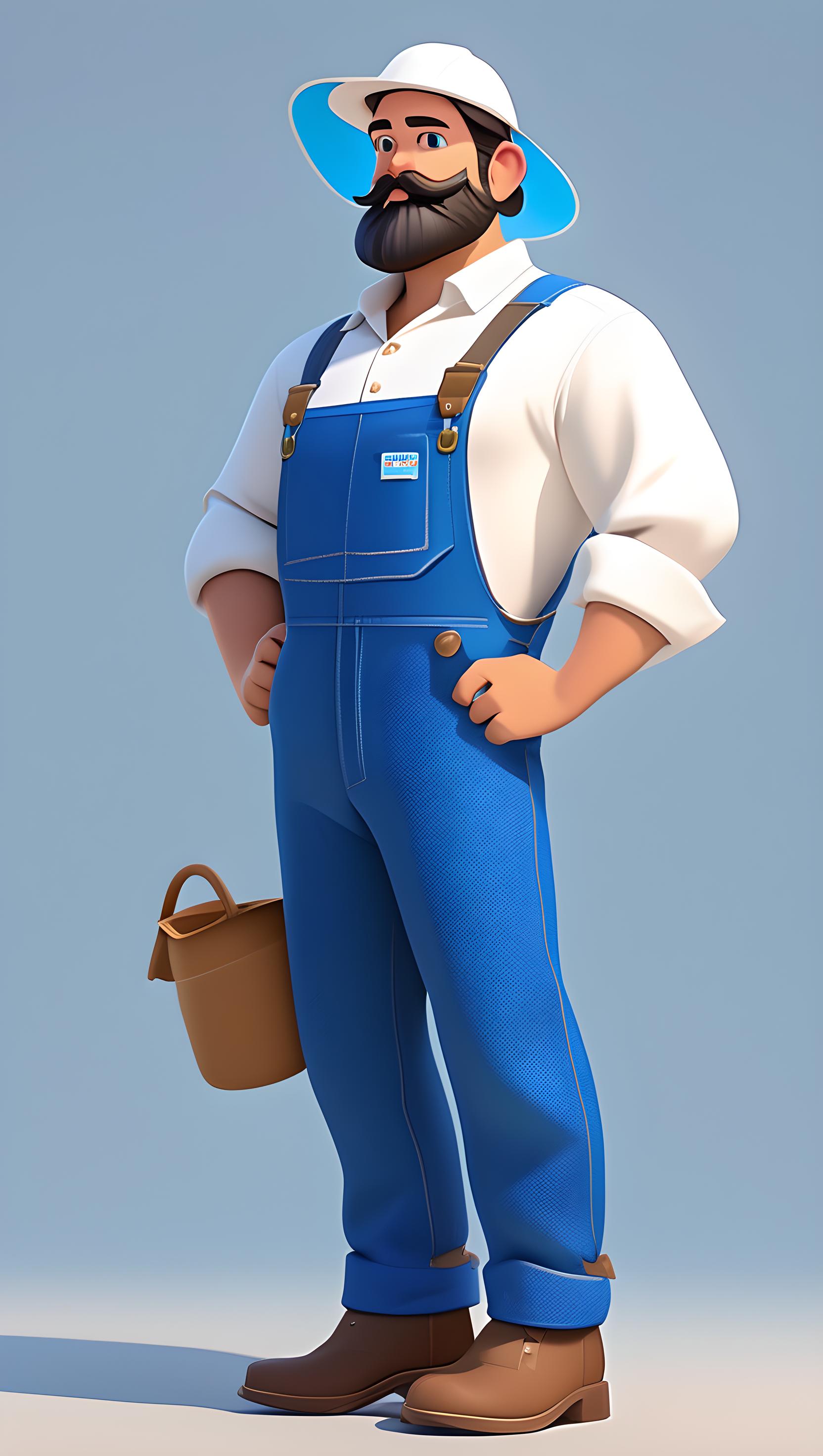 卡通美国农夫,络腮胡,头戴蓝色安全帽,白色衬衣,蓝色背带裤,3D渲染风格,迪士尼风格,完整的身体,精美的细节,简单,简单的灰色背景,