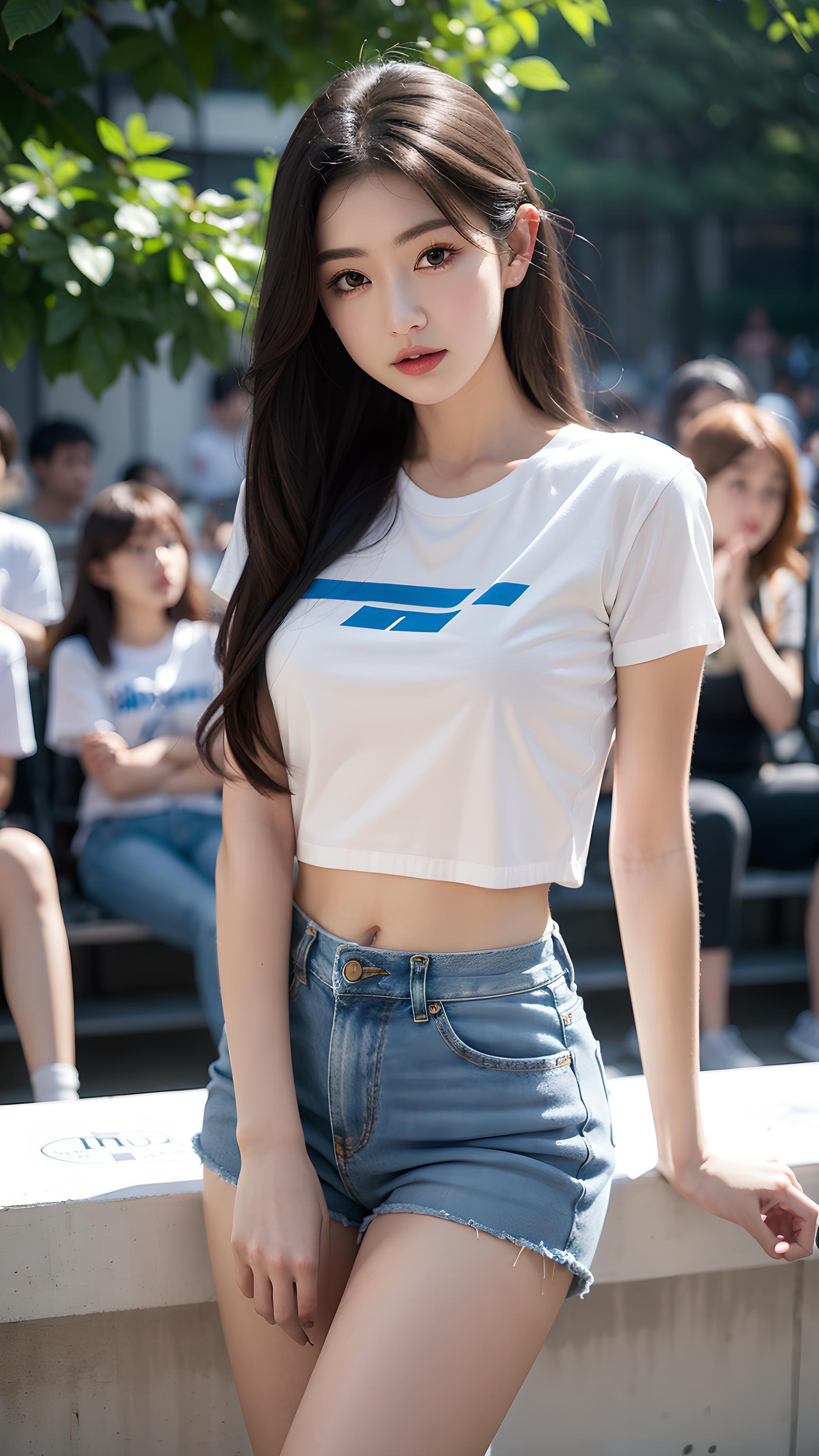 下身穿牛仔短裤