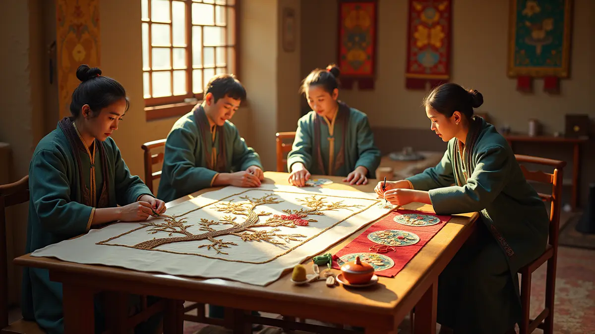 以 AI 生成 16:9 超写实非遗技艺场景图片,聚焦浙江与阿克苏刺绣技艺的共创融合。