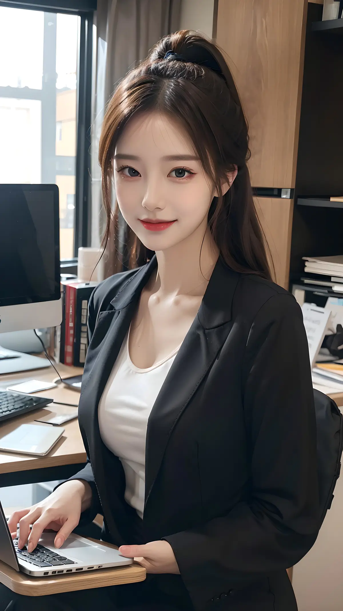 办公室背景,身着剪裁得体的深色西装套裙,内搭白色衬衫,长发束成干练的低马尾,妆容精致淡雅,手持文件夹或笔记本电脑,眼神坚定自信,嘴角带着从容的微笑,光线明亮柔和,凸显专业干练的职业气质。