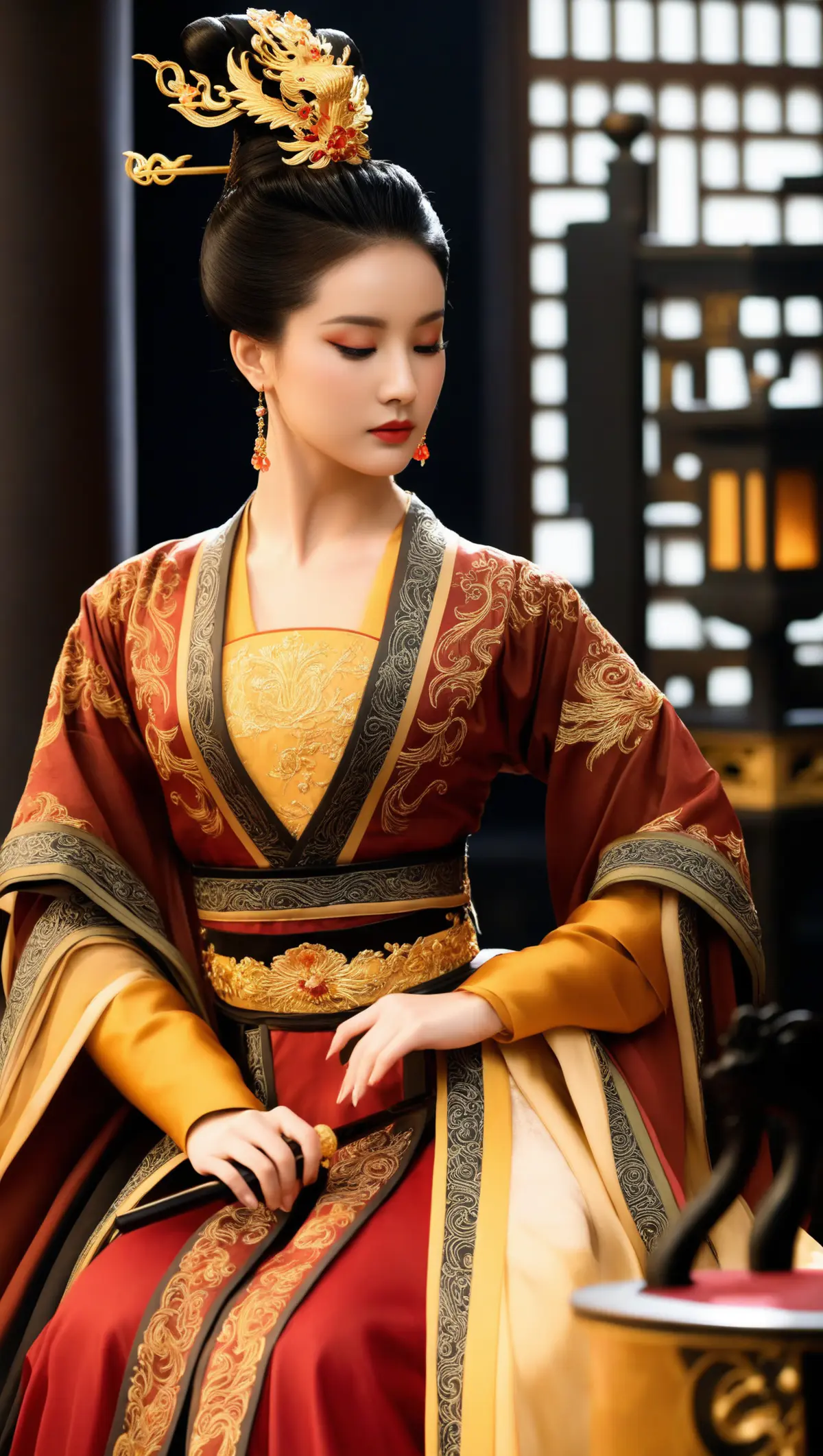 - 发型与头饰:乌黑长发被精心盘成高耸的发髻,头顶佩戴着一枚金色龙形凤冠,造型华丽繁复,两侧还点缀着金色的步摇式发饰,尽显华贵大气。