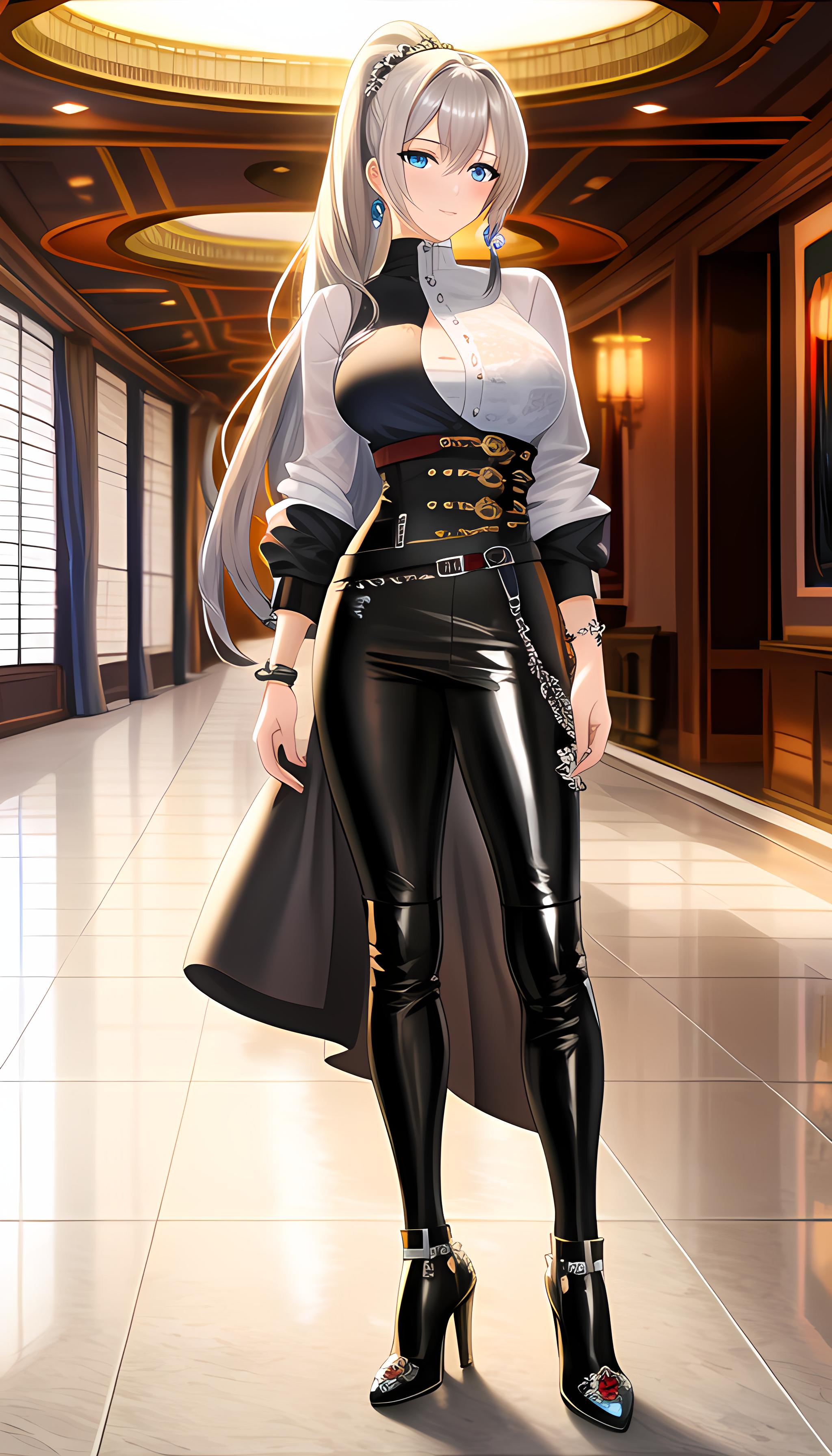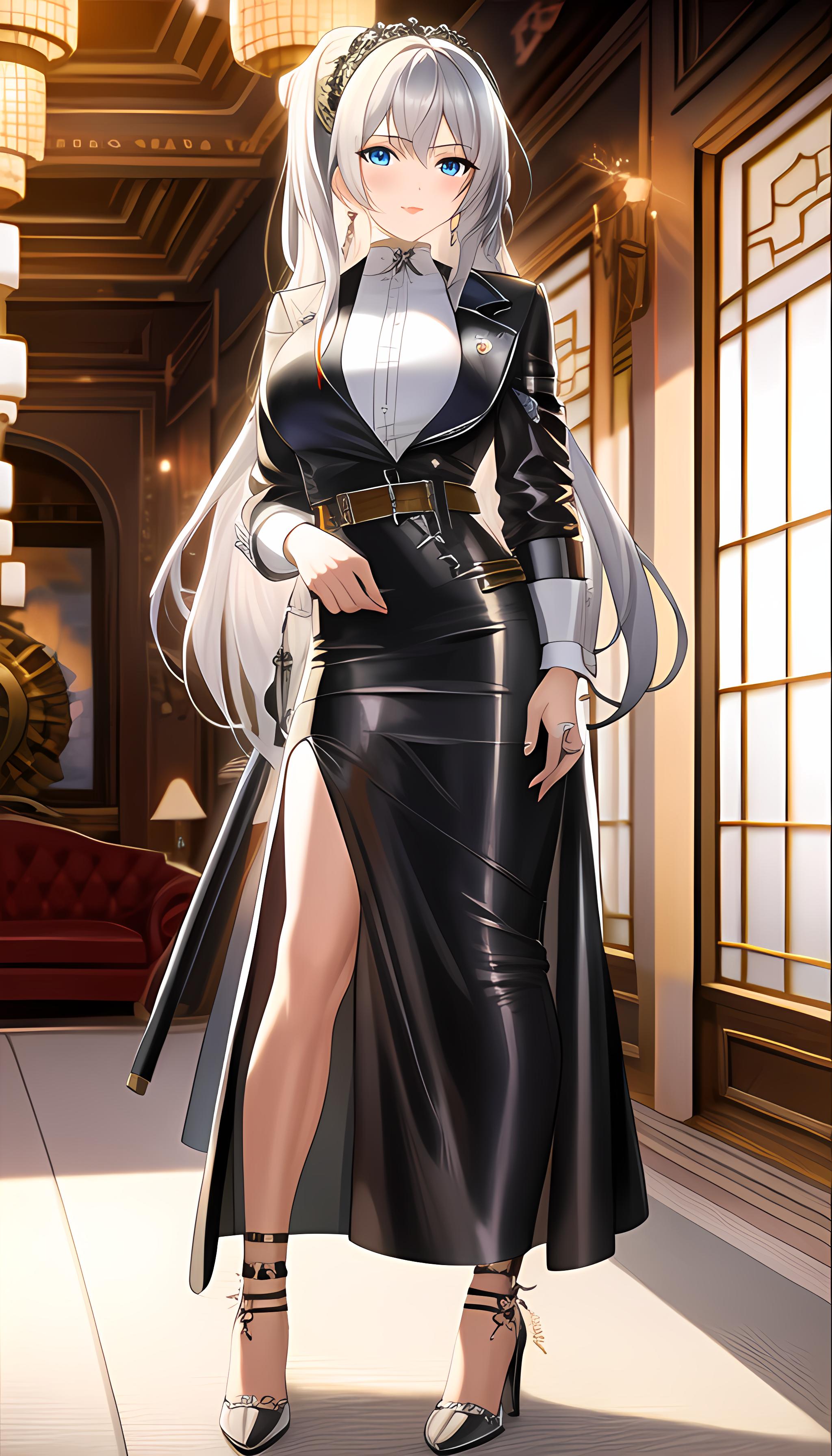 (杰作),最好的质量,高度细节,极其详细的CG统一8k墙纸,插图,精致的渲染,极致细节,电影照明,((1girl)),银色长发,蓝色眼睛,白寸衫,黑色紧身皮裤,金属光泽,黑色高跟鞋,性感,大胸,御姐,机车少女,全身照,模特,哈雷摩托车,全景