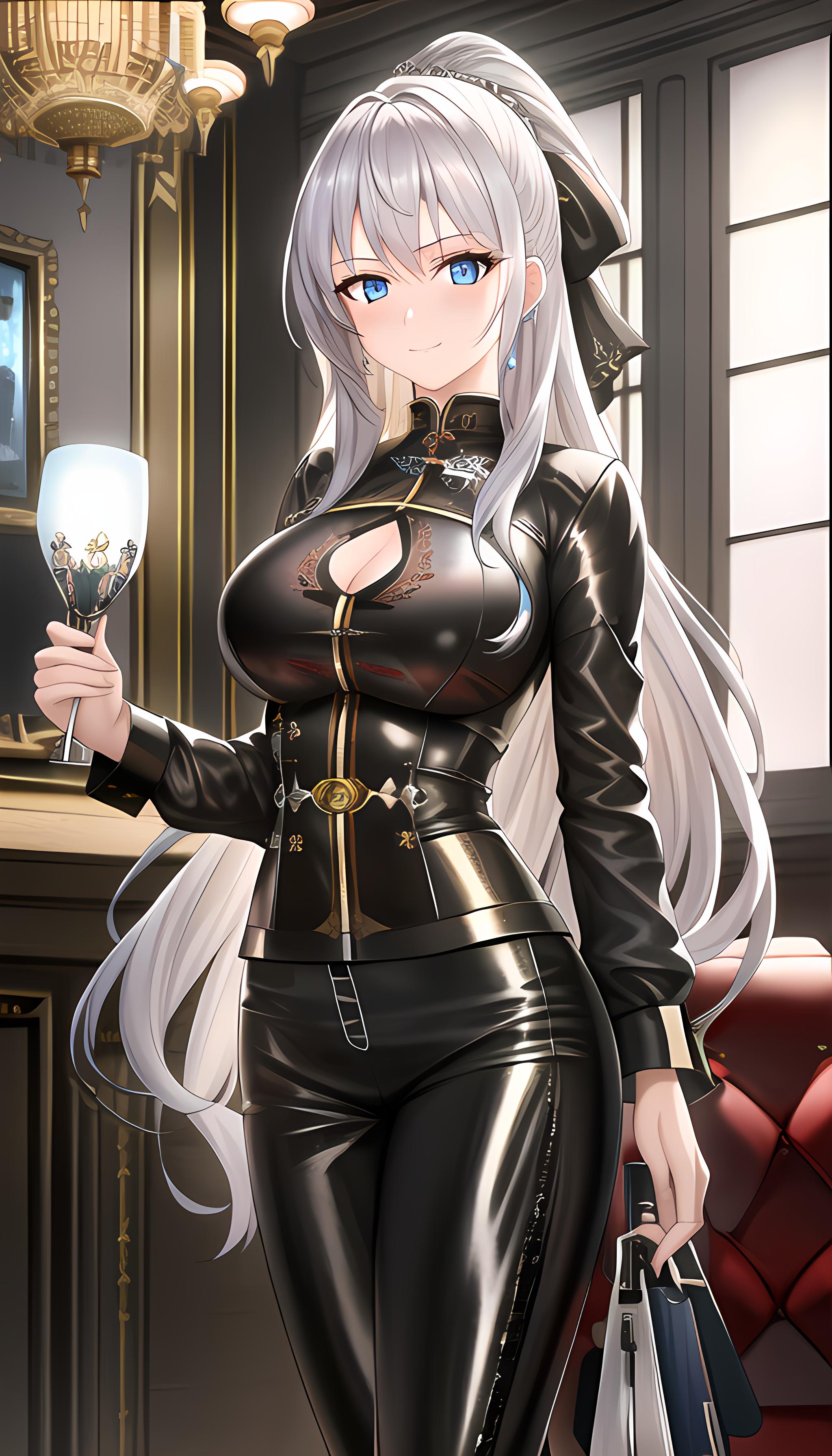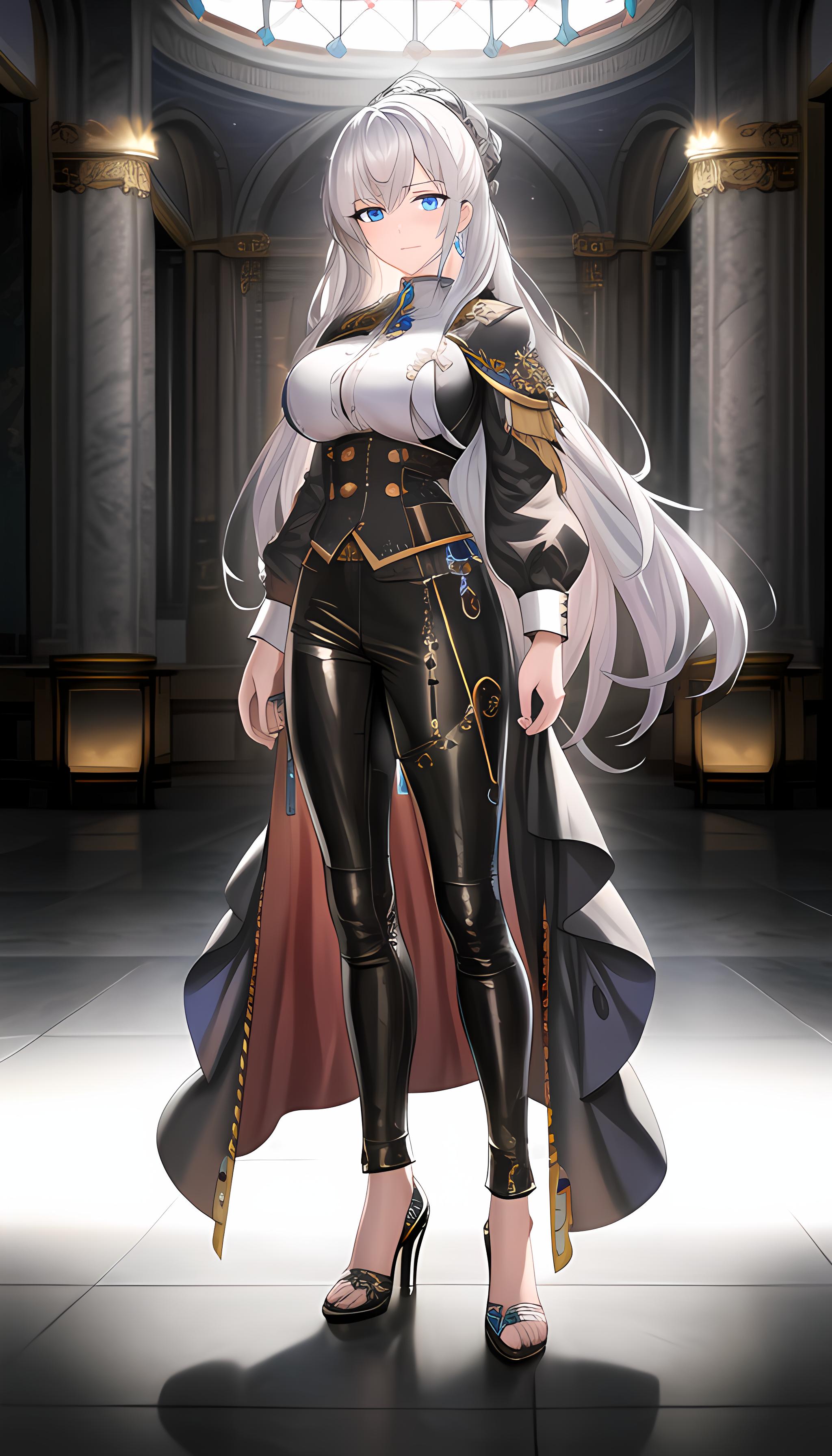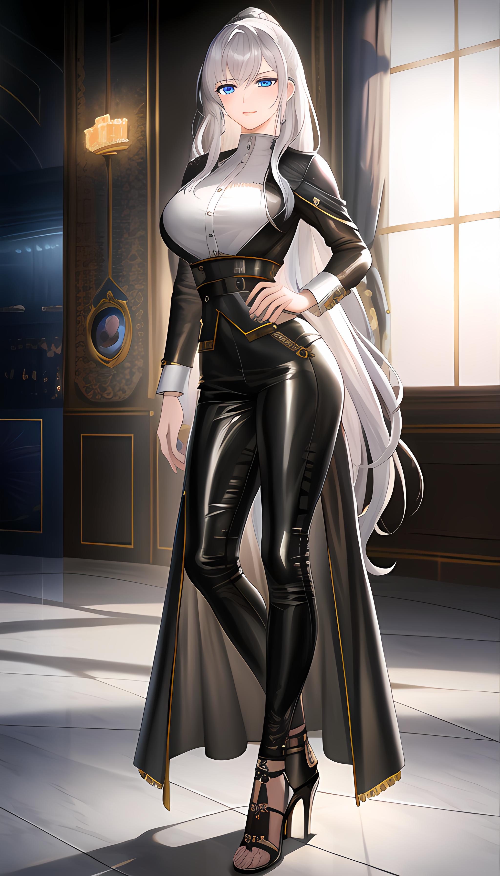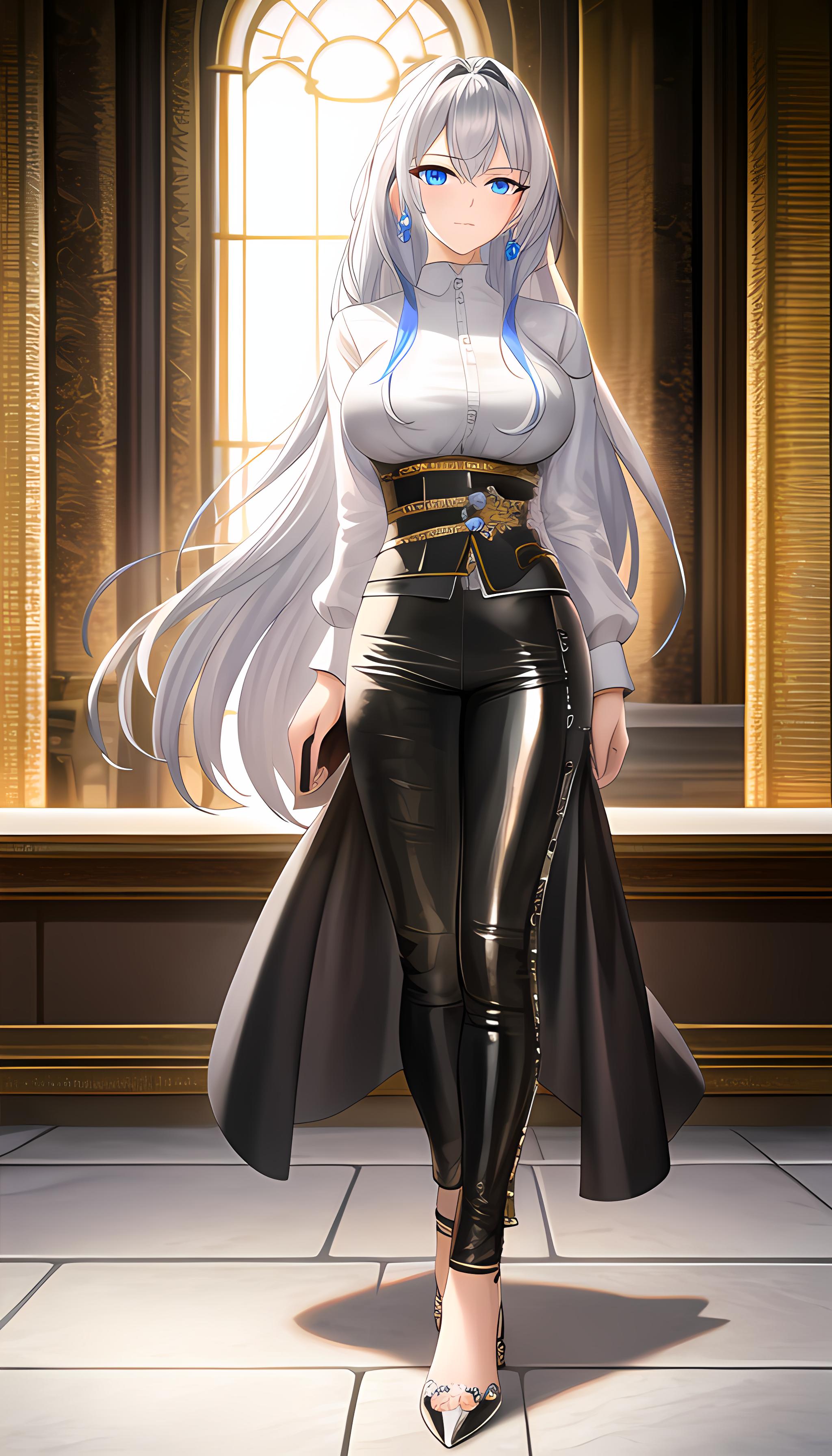 (杰作),最好的质量,高度细节,极其详细的CG统一8k墙纸,插图,精致的渲染,极致细节,电影照明,((1girl)),银色长发,蓝色眼睛,白寸衫,黑色紧身皮裤,金属光泽,黑色高跟鞋,性感,大胸,御姐,机车少女,模特,全景