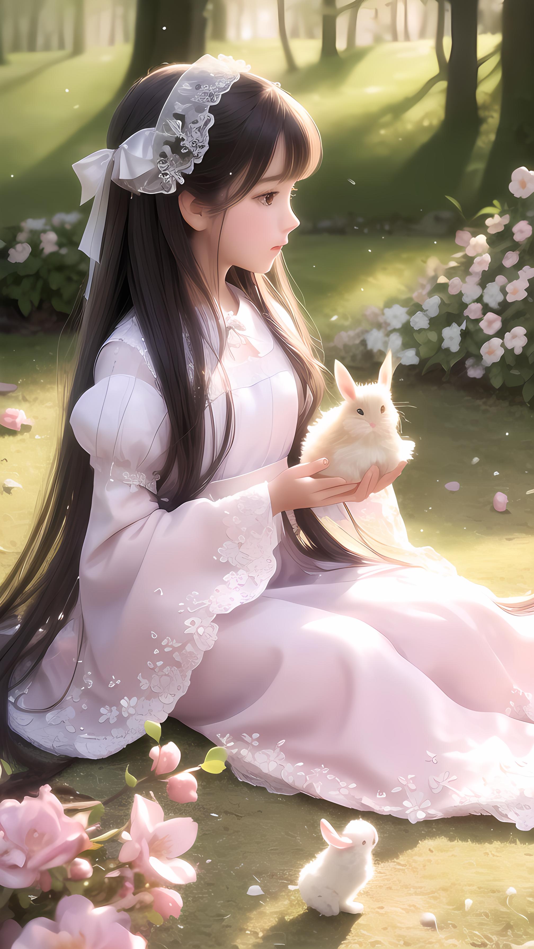 最高画质,杰作,精美的cg,超可爱的小萝莉正脸,可爱的五官,白色蕾丝内衣,蝴蝶结发饰,淡粉色长发,浅色瞳孔,光影追踪,画面丰富、超高清、16K,小巧精致的嘴巴,可爱精致的鼻子,抱着可爱的小兔子,梦幻森林,繁花盛开,萤火虫