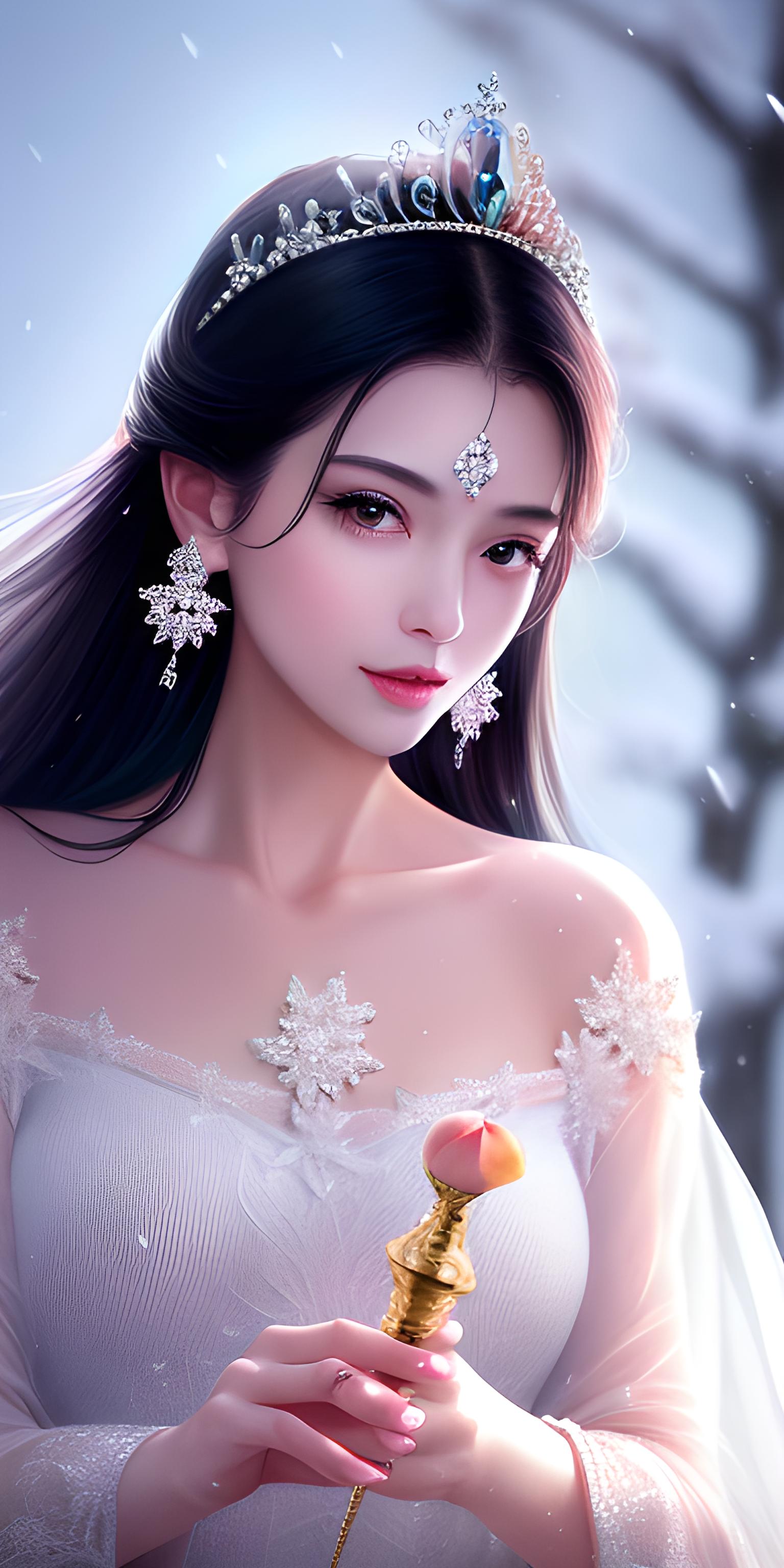 画面极佳,精致的锁骨,穿着半透明针织衫,黑色打底裤,容貌俏丽的少女,踏雪前行,(近景),(雪景),脸部轮廓清晰,黑色长发披肩,(桃花盛开) 为背景,微风拂过,(轻柔的音乐),空气中弥漫着清新芬芳的松林味道,(清晨或黄昏的阳光) ,近摄,近距离拍摄,耳环,戒指,女帝,头戴王冠,手持权杖,