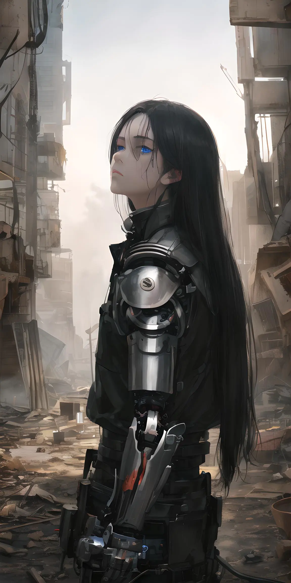 年轻的美少女,白色长发,哀伤的表情,红腮,阴沉的背景,精致的五官,灵动的蓝眼神,极致细节,世界末日,战争场面,破败的机械城背景,破碎的躯体,损伤的机械手臂,超精细细节,大师作品,真实质感,电影照明真实感,完美作品,8k,高清