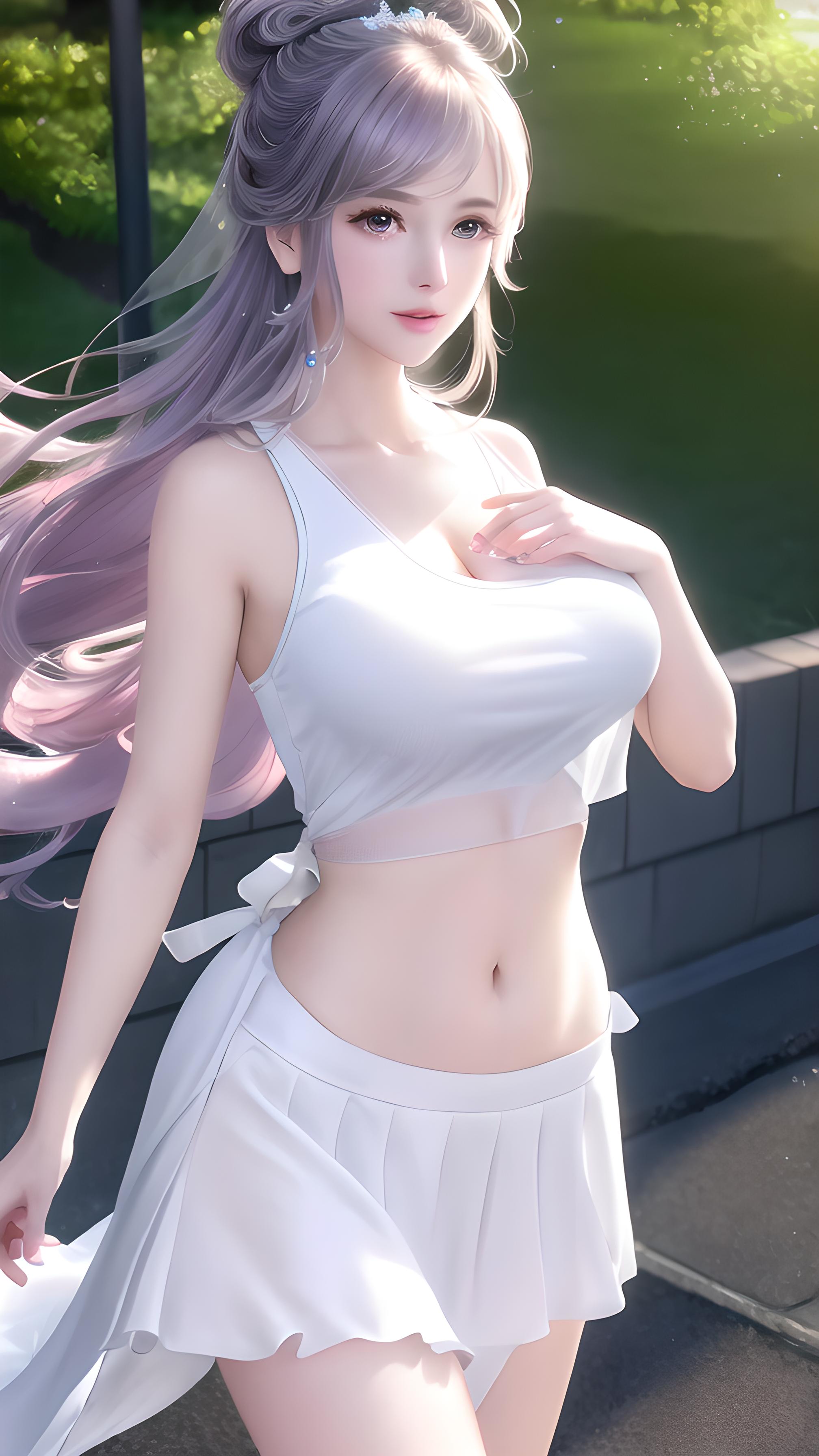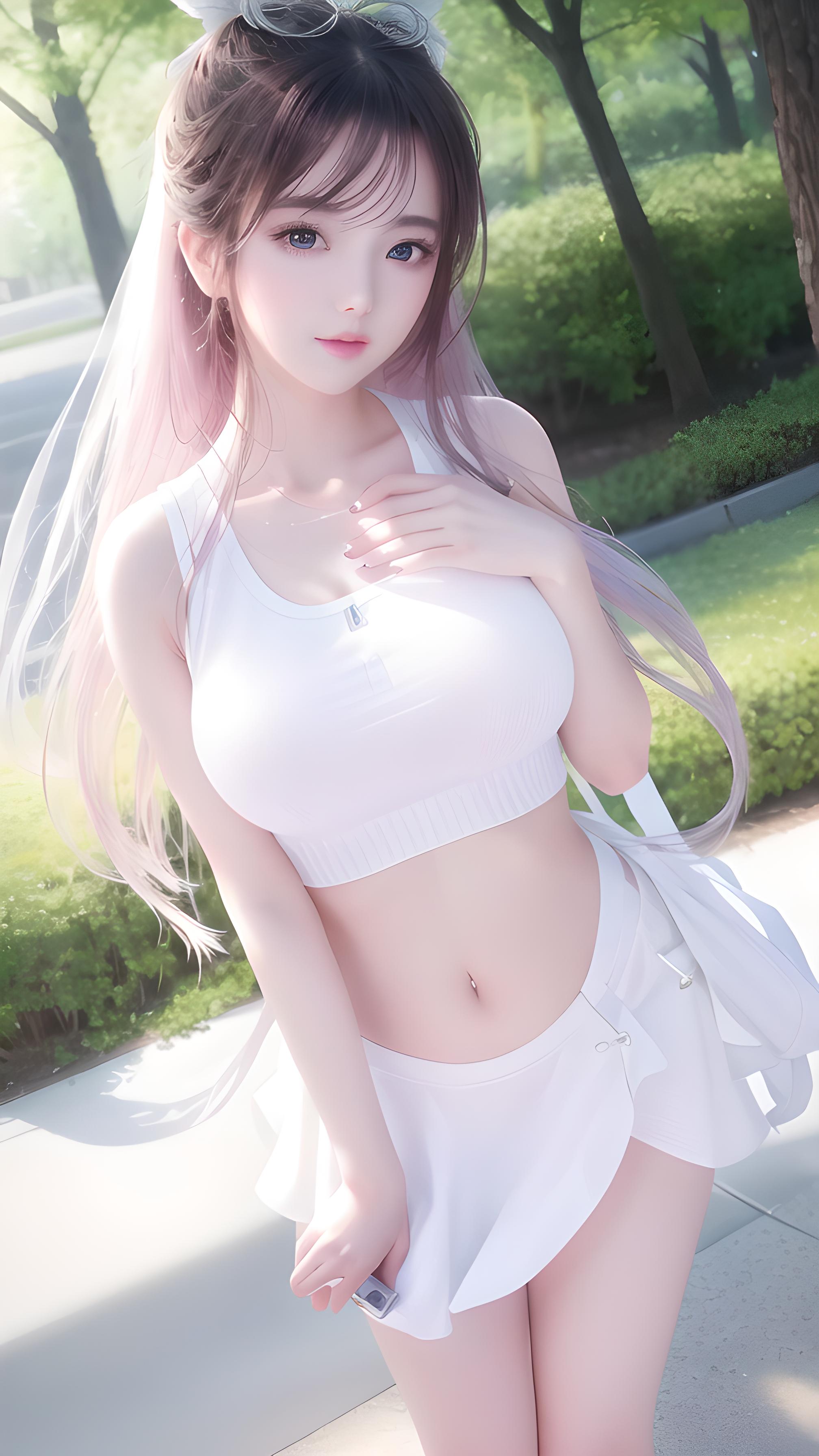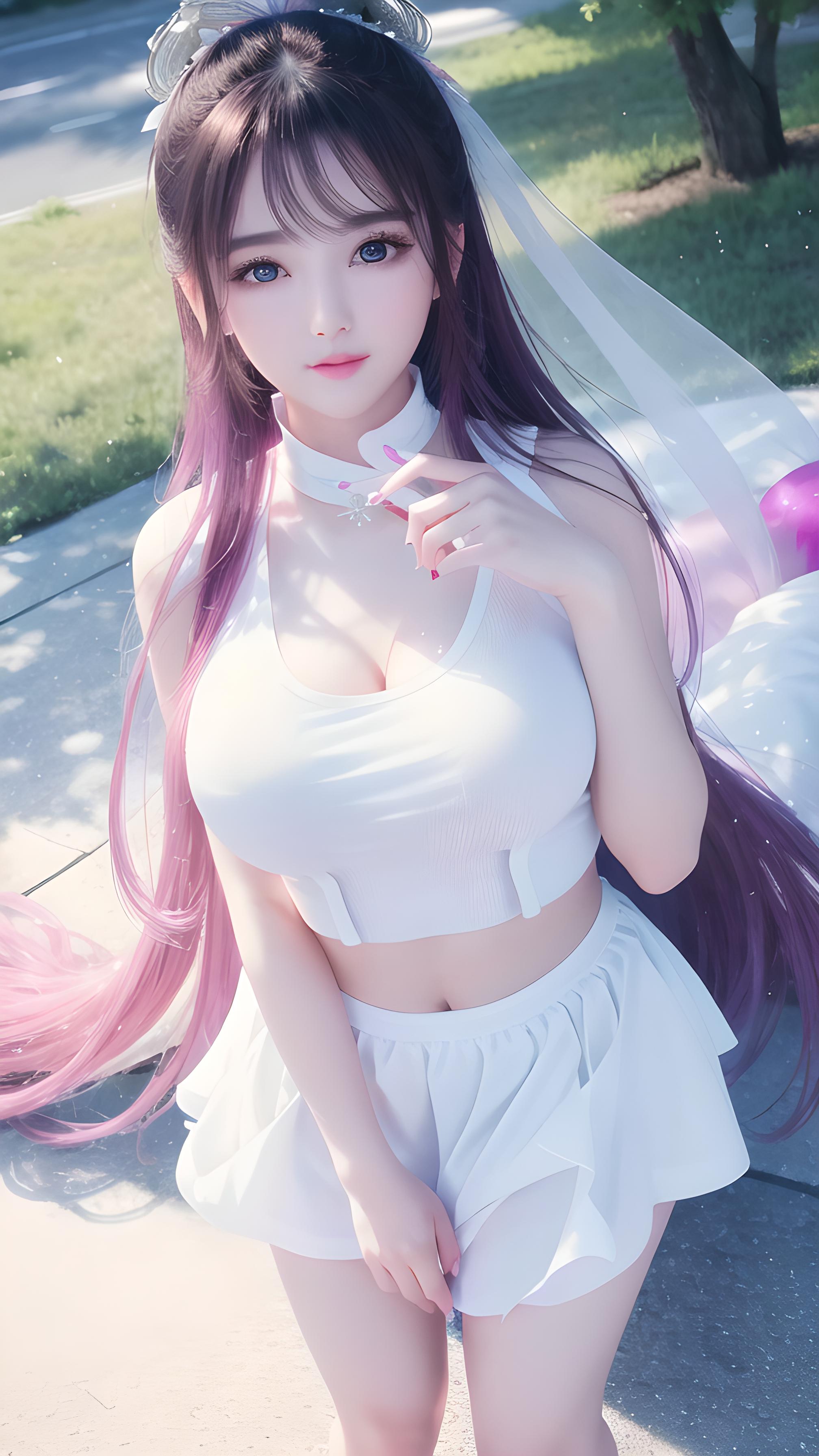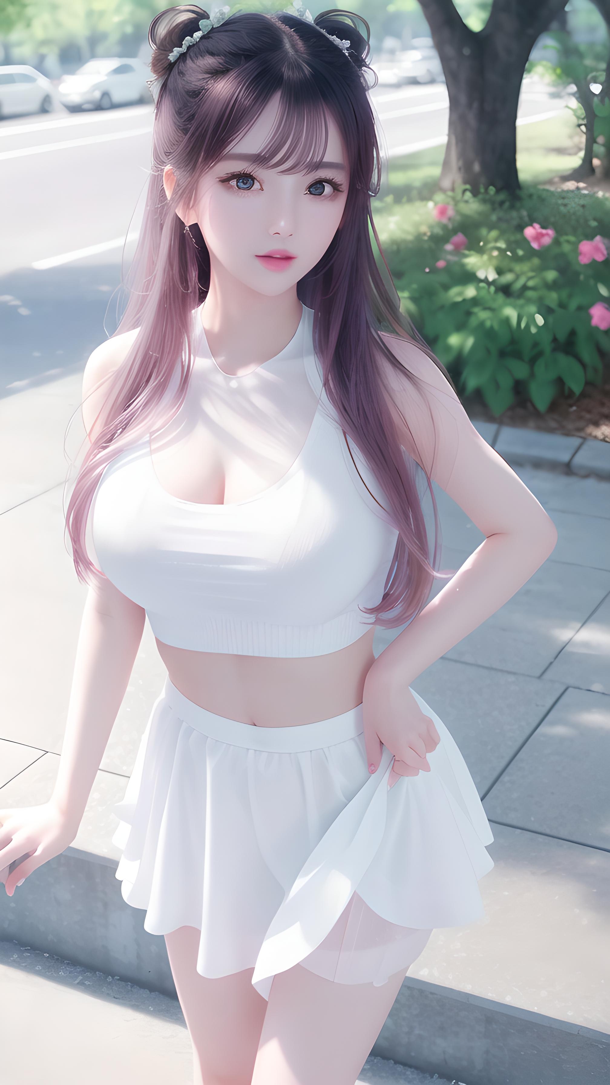 大师作品,高细节,8k分辨率,干净虚化的背景,极致细腻的美少女,水嫩白皙的皮肤,精致的五官,完美的脸,双腿间,明亮的大眼睛,长睫毛,水嫩的嘴唇,紫红色凌乱发,站立在街边(白色背心,漏肚脐,漏胸,白色百皱裙),完美身材,优雅曲线,迷人气质,极端细节,逼真细节,近摄