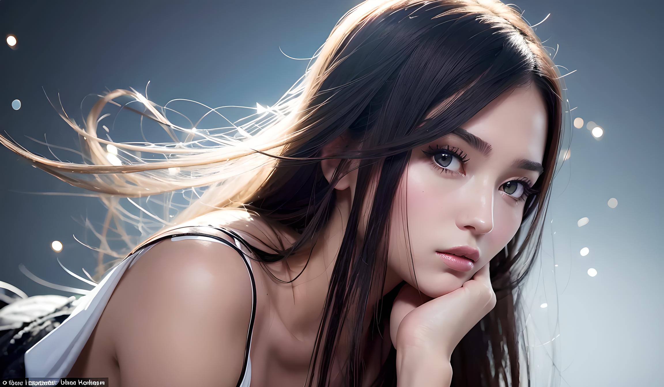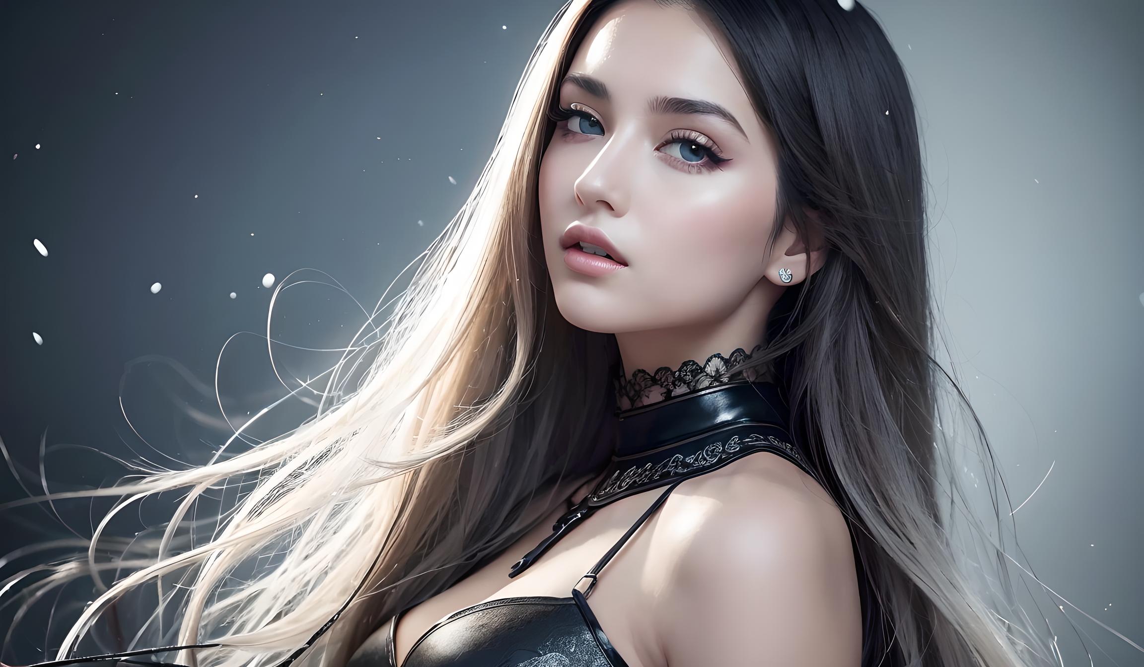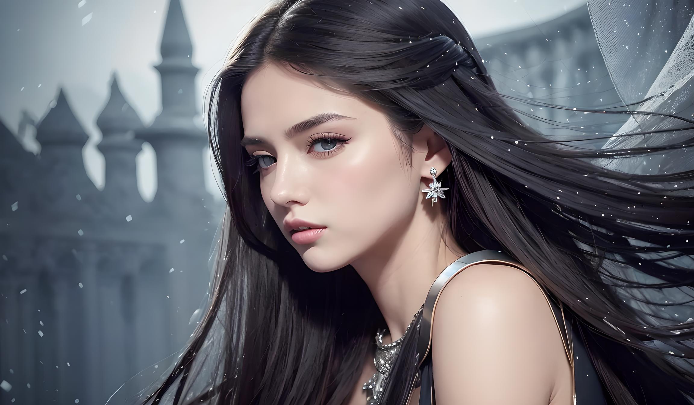 她的长发飘逸,如同黑色的瀑布,轻轻地拂过她的肩膀。她的皮肤白皙如雪,光滑细腻,散发着淡淡的香气。