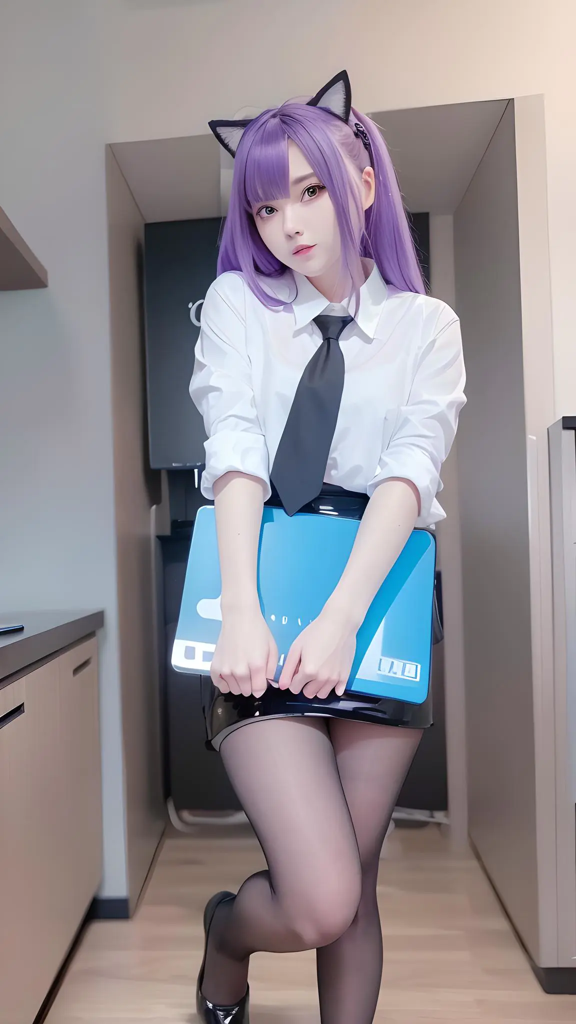 1girl,animal_ears,black_footwear,cat_ears,computer,hair_cones,keyboard_(computer),laptop,monitor,mouse_(computer),office_lady,pantyhose,pencil_skirt,photo_(medium),purple_eyes,purple_hair,shoes,short_sleeves,sitting,skirt,solo,white_shirt,rating:safe