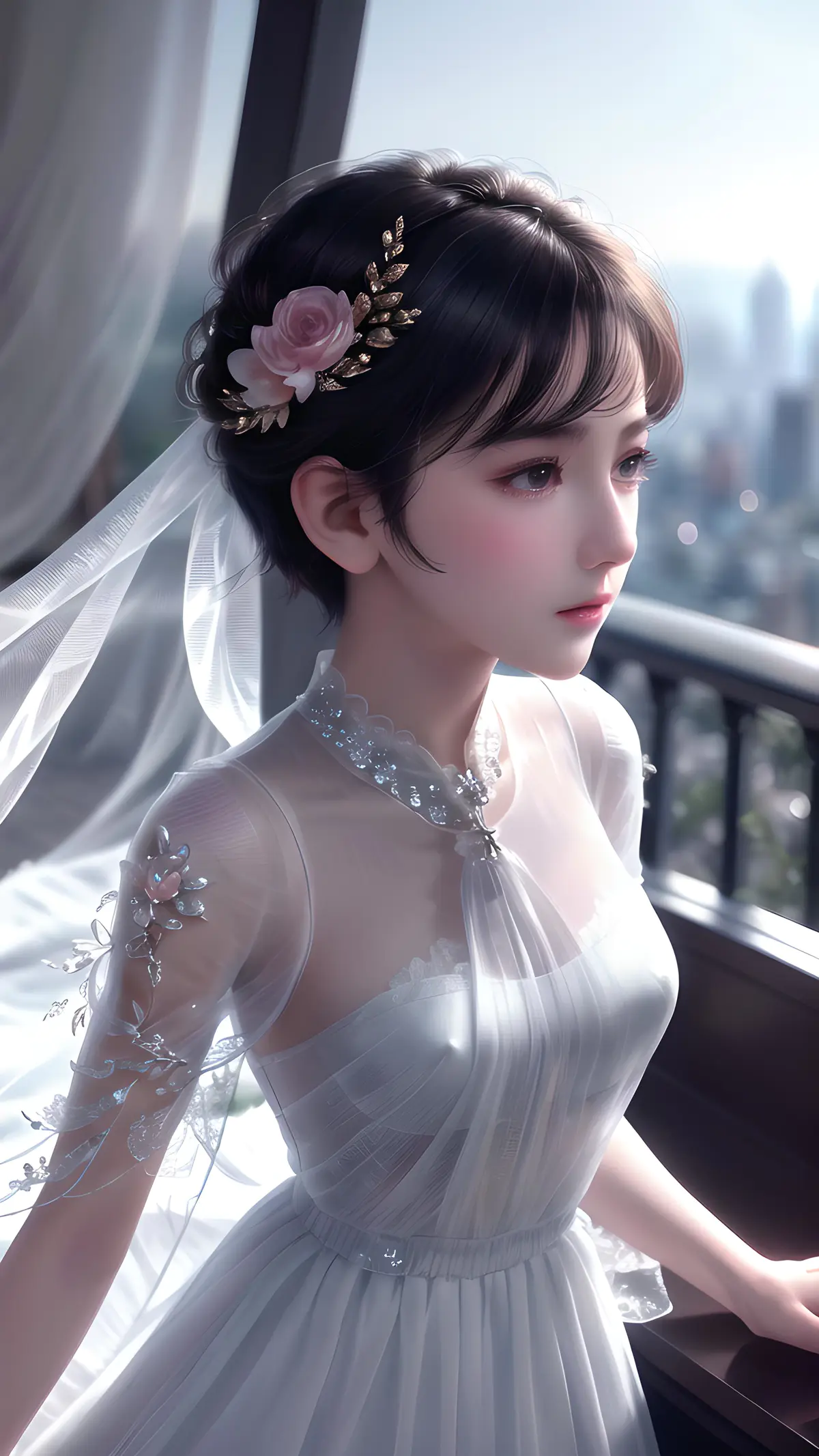 最好画质,超高分辨率,高细节,大师作品,8k分辨率,(wlop),一个很萌的萝莉,发光眼睛,粉红嘴唇,美妆,短发,黑发,水嫩透亮的皮肤,华丽复杂的白纱裙,面部特写,写实肖像,贴近屏幕,城市,阳台,立体感,真实质感。
