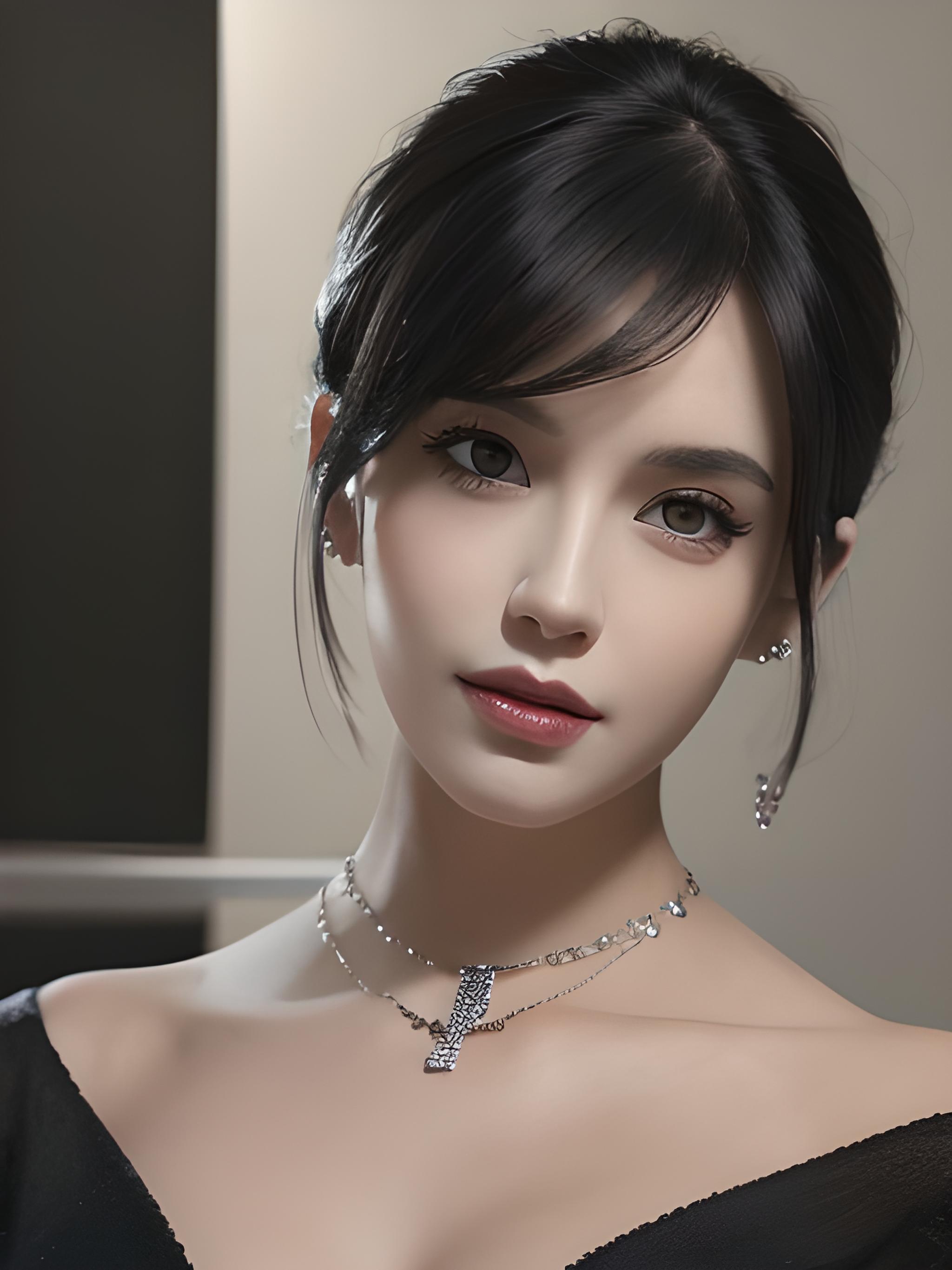 一个神气的美女,黑色短发,戴项链耳环,v字手势,