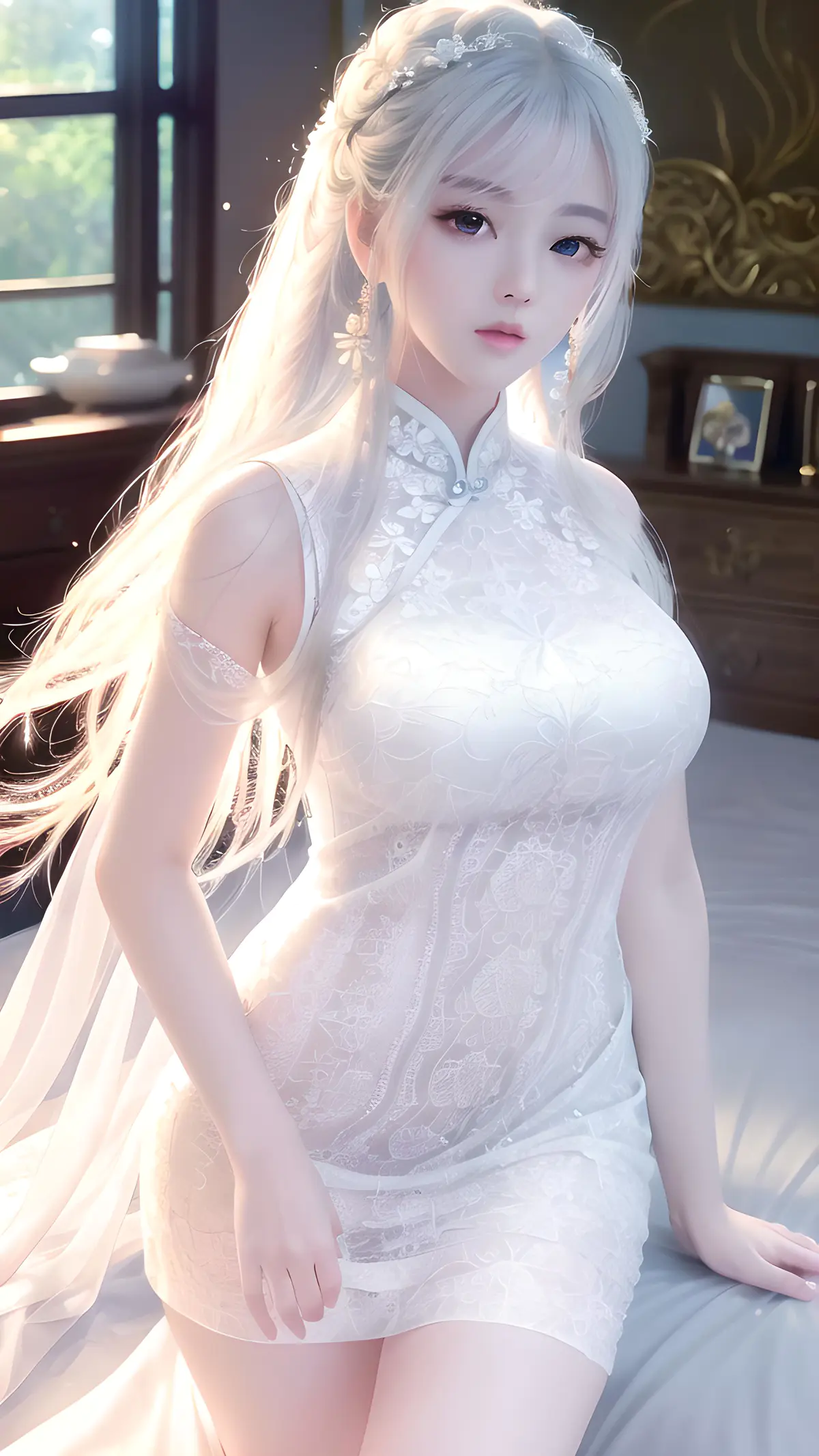大师作品,高细节,8k分辨率,干净虚化的背景,极致细腻的美少女,水嫩白皙的皮肤,精致的五官,完美的脸,明亮的大眼睛,长睫毛,水嫩的嘴唇,白色凌乱发,(白色无袖旗袍),完美身材,优雅曲线,迷人气质,极端细节,逼真细节,近摄,透明蕾丝旗袍,半露身材,丰满,诱惑,性感,精致奢华的房间,精致奢华的大床上孕妇
