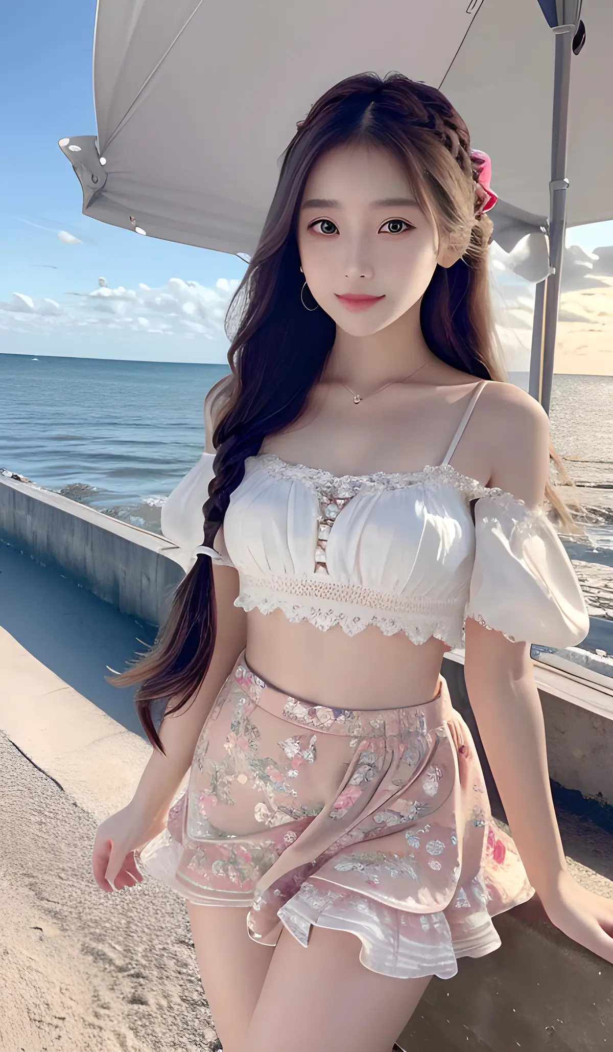 一个稚嫩可爱的少女,宽松刺绣小花上衣,半身裙,五颜六色,夏天,背景是沙滩,高细节,8k分辨率,超高分辨率,彩虹色亮光长发,麻花辫子,彩色清澈眼眸,头戴五颜六色的花,(顺滑的头发,精致完美的五官最美的大眼睛,长长的睫毛,眼睛甜美有卧蚕,微笑,动态角度,极致画质,最高精度,精确完美的人体结构,全身正面图,站在海边,
