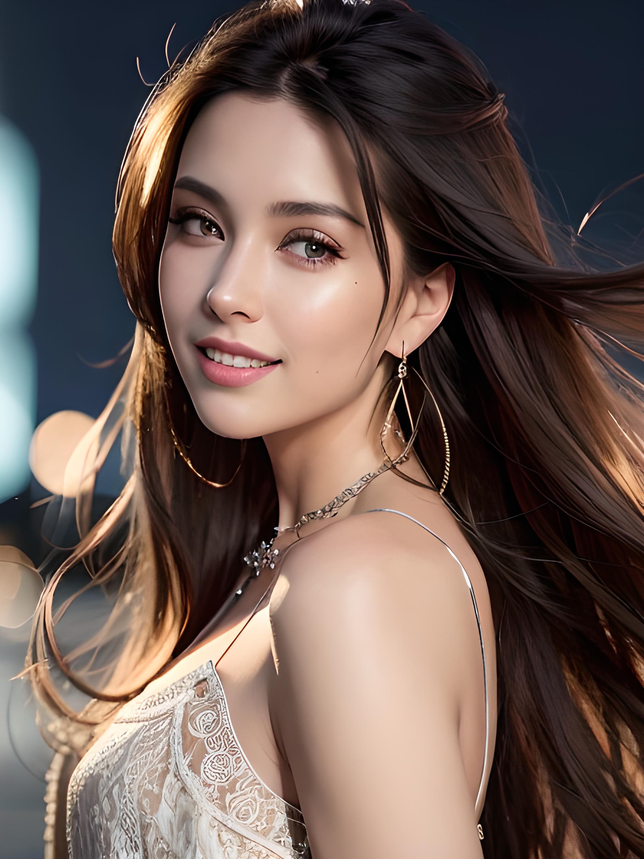 美丽的长发女神,戴项链耳环,夏天,夜晚在大都会广场,侧身面对镜头,微笑,风吹乱头发,