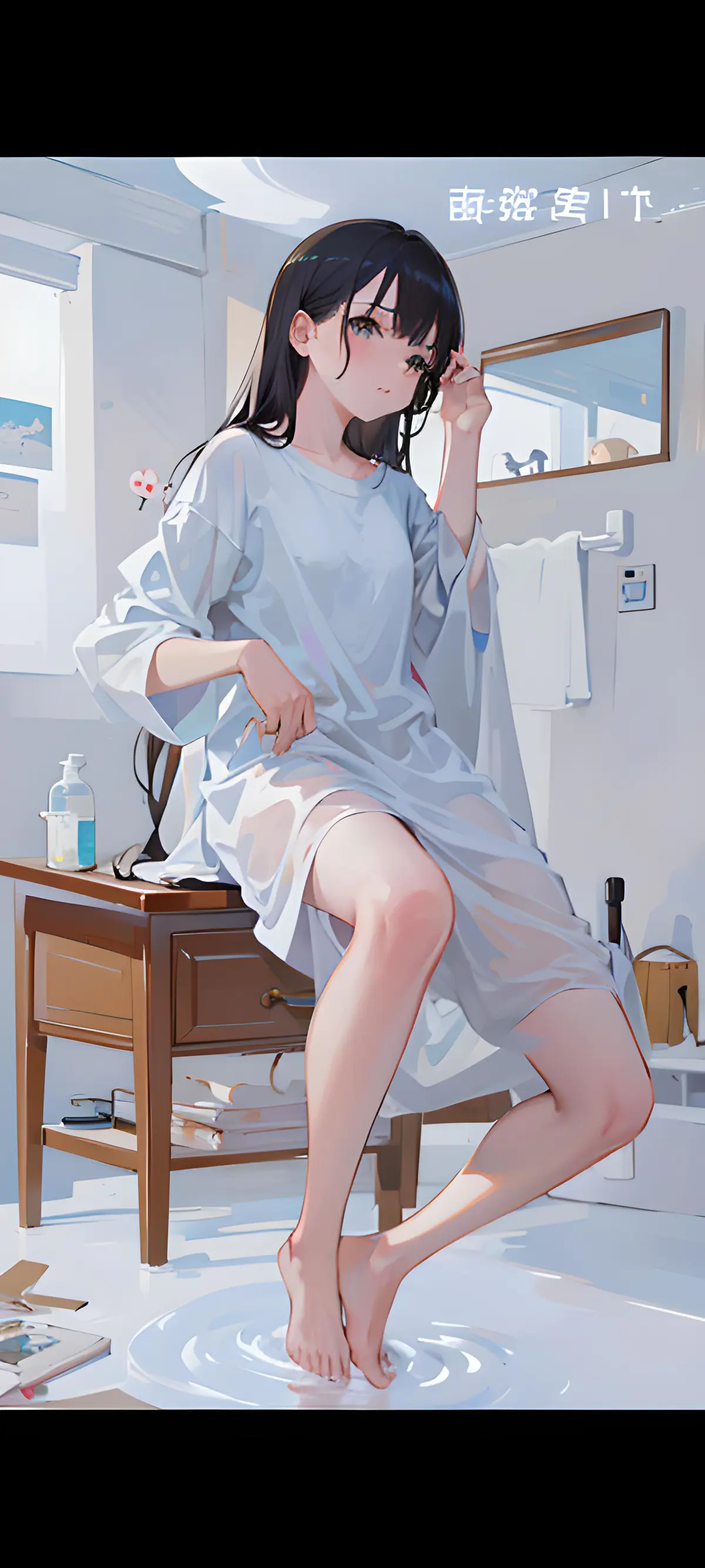 1girl,alarm_clock,animal,barefoot,bath,bathing,bathroom,bathtub,bed,bed_sheet,bedroom,black_border,border,canvas_(object),cat,cum_pool,cumdrip,desk,dog,donation_box,drawer,easel,faucet,faux_figurine,indoors,letterboxed,long_hair,lying,nude,on_bed,onsen,page_number,painting_(object),partially_submerged,phone_screen,photo_(medium),photo_inset,pillarboxed,reference_inset,room,sitting,soaking_feet,soap_bubbles,stool,table,trash_can,vase,viewfinder,water,white_cat