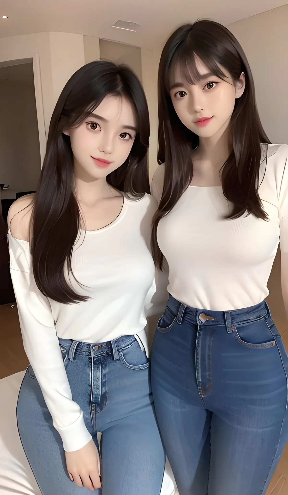 ((((((两个绝美少女)))))),两个精致的美女,一样高,《双人站着》,(((圆领上衣牛仔裤))),白里透红的肌肤,大眼睛,(((两个绝美的少女))),瘦脸,红唇,柔顺长发,中分发型,修长笔直的大长腿,全身,纤细的腰肢,最好的身材,露腰,偏瘦,室内,明亮灯光,卧室,全景,最美画面,8k分辨率,超高清画质,最好的画质,大师作品,完美的像素,