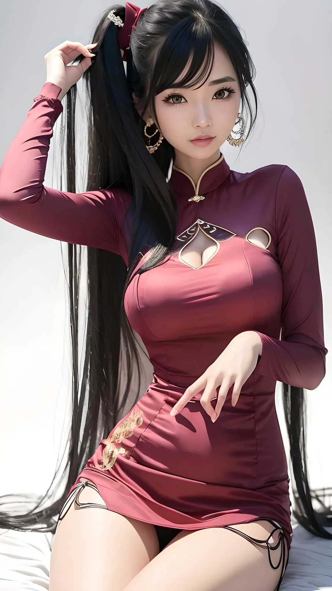 1girl,black_hair,breasts,china_dress,chinese_clothes,cleavage_cutout,clothing_cutout,dress,earrings,jewelry,large_breasts,long_hair,looking_at_viewer,side_slit,sitting,smile,solo,taut_clothes,thighs,very_long_hair