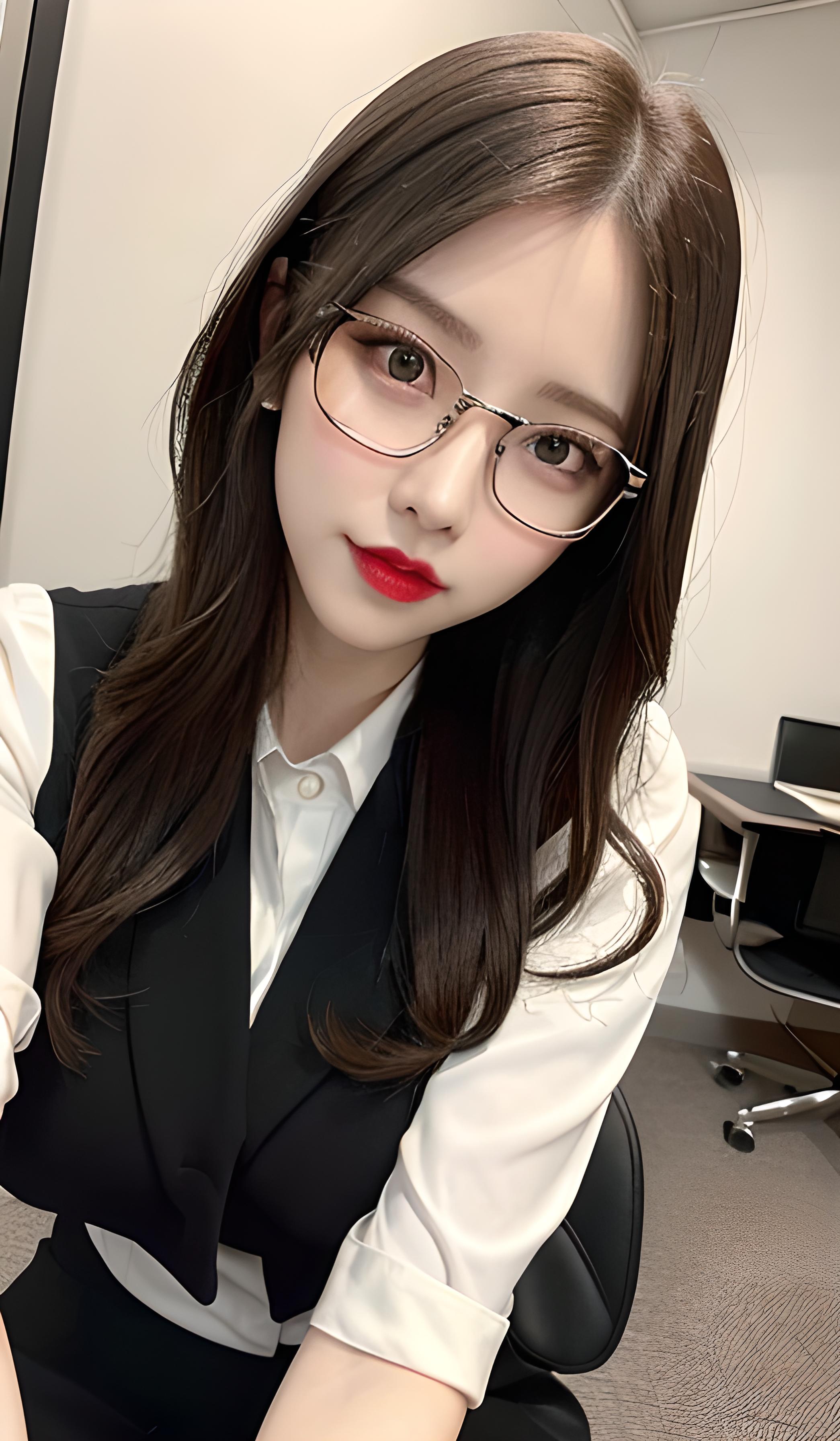 全身照特写,看着你,精致的妆容,红唇,明亮的大眼睛,纯欲,气质美女,水嫩白皙的皮肤,黑色长发,蓬松的头发,发丝细节,精致的五官,卧蚕,完美的脸,戴眼镜,黑色西装,上班照,办公桌,短裙,办公室,会议室,职场美女,office lady,