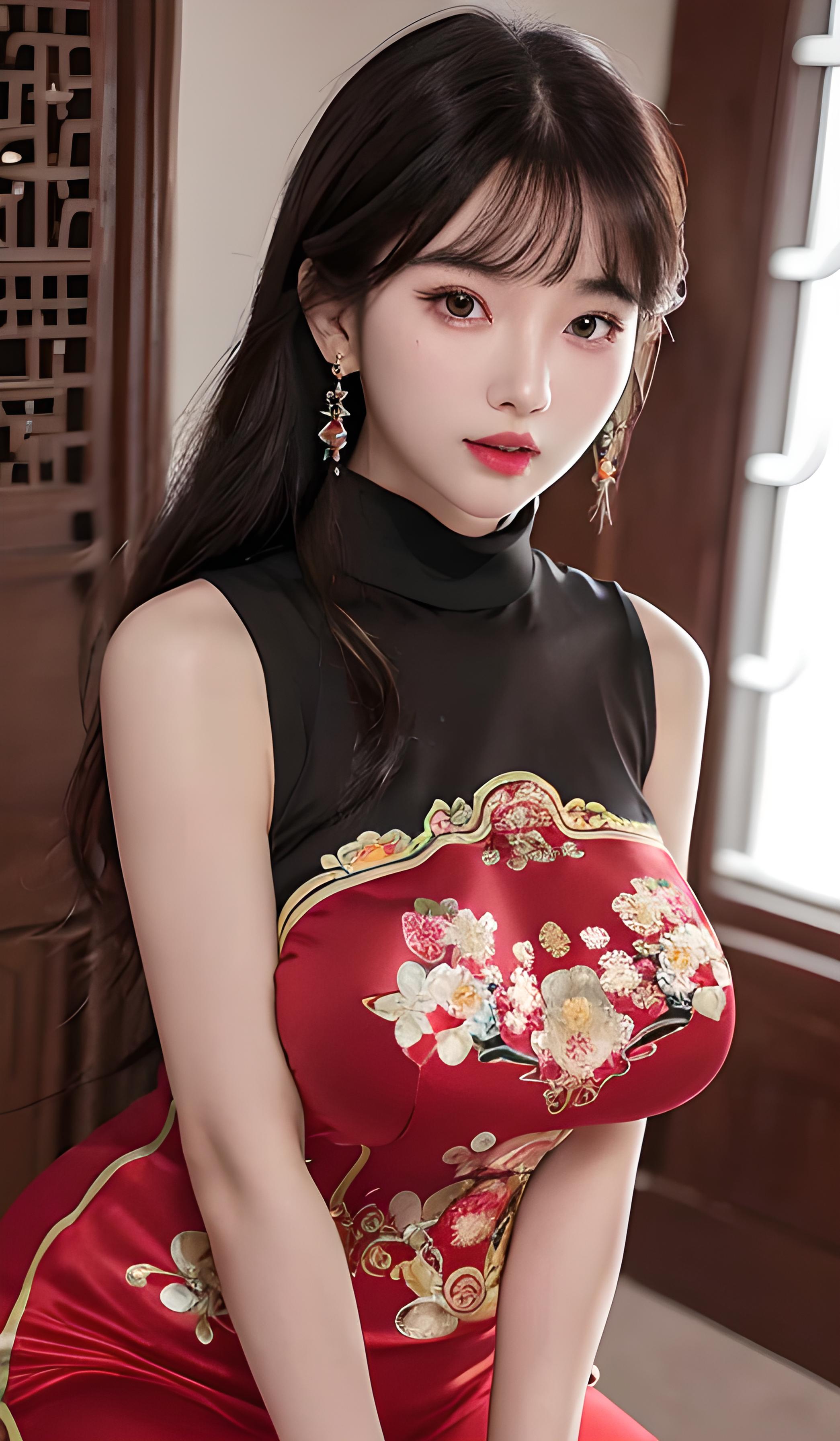 高细节,8k分辨率,超高分辨率,黑色长发(梳着露颈盘发),黑色清澈眼眸,精致完美的五官,最美的大眼睛,长长的睫毛,眼睛甜美有卧蚕,微笑,红唇,极致画质,精确完美的人体结构,((精致的五官)),((细节的脸部刻画)),looking at viewer,((一个成熟冷艳的女孩,穿着复古旗袍((高领无袖旗袍(圆领无袖T恤衫),随机颜色,精美刺绣,透明材质)),背景为闹市街区)),(big boobs),身材丰满,(乳巨),精修手,不走光,不违规,(Hold your chest with both hands)。隐私部位巨大,非常大的胸部,(big boobs),(胸部超级大),超级大的胸部,(((丰满挺翘的巨胸(圆型巨胸,40G)))),大长腿(穿着黑色透明连裤袜),((精美古风发簪、项链、耳坠)),动态角度,面向观者,侧身立,全身镜头,中景镜头。