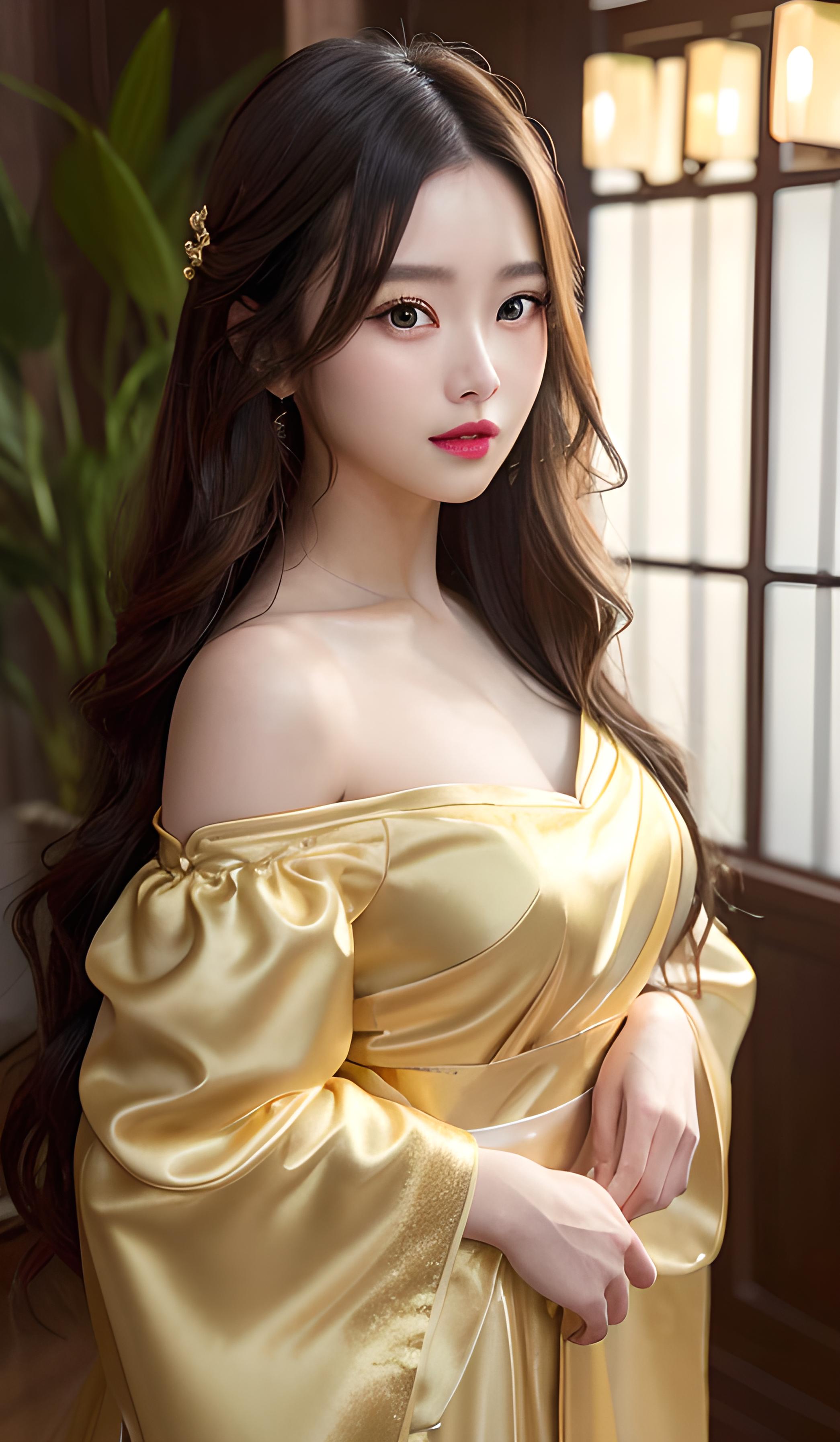 大师作品,8k分辨率,(精致的五官),迷人的女孩,蓝宝石般的眼瞳,发光皮肤,完美的脸,奶茶色波浪卷长头发,油光水润的红唇,微笑,浓妆,蓬发,盘发,闪亮的头发,长发绺,露颈盘发,清纯,((金色汉服丝绸薄纱露肩长裙,身材高挑,绝世容颜)),半身照,中式庭院,