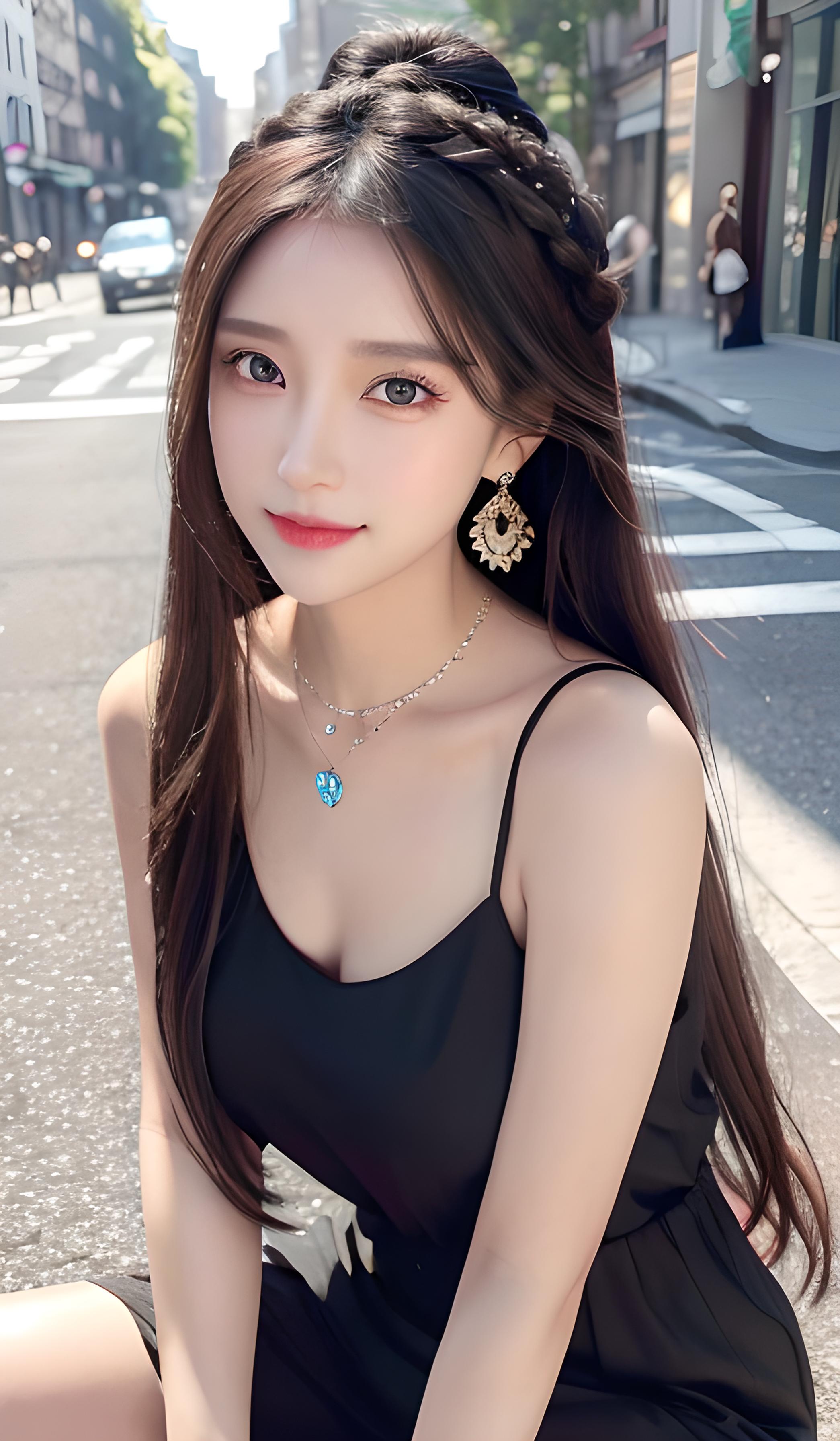 高细节,8k分辨率,超高分辨率,一个可爱的女子,黑色亮光长发麻花辫子,五颜六色的雪纺衬衫,彩色清澈眼眸,头戴五颜六色的鲜花,(顺滑的头发,锁骨,精致完美的五官,最美的大眼睛,长长的睫毛,眼睛甜美有卧蚕,微笑,项链,耳坠,在繁华街道,坐在地上),动态角度,极致画质,最高精度,精确完美的人体结构,丁达尔效应,