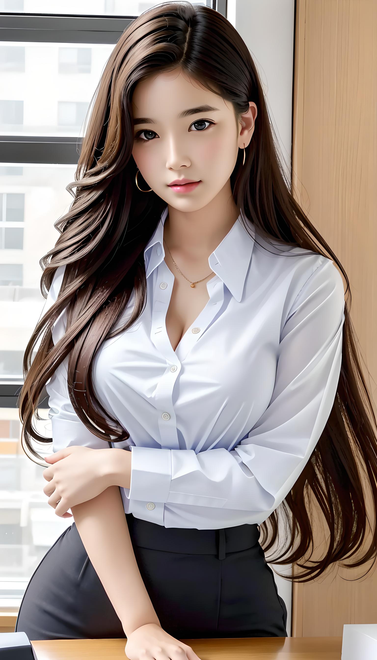 best quality, photorealistic, 8k, high res, 1girl, woman, (skindentation), (professional lighting), ((close buttoned office shirt)), (portrait:0.6), gorgeous, (long hair:1.7), (1girl eyes looking at viewer:1), ((looking at viewer:1.6)), (1girl looking at the camera), photorealistic, (bokeh), (portait:0.6), (dynamic pose:1.2), masterpiece, intricate, realistic, sharp focus, award-winning photograph, .71>
