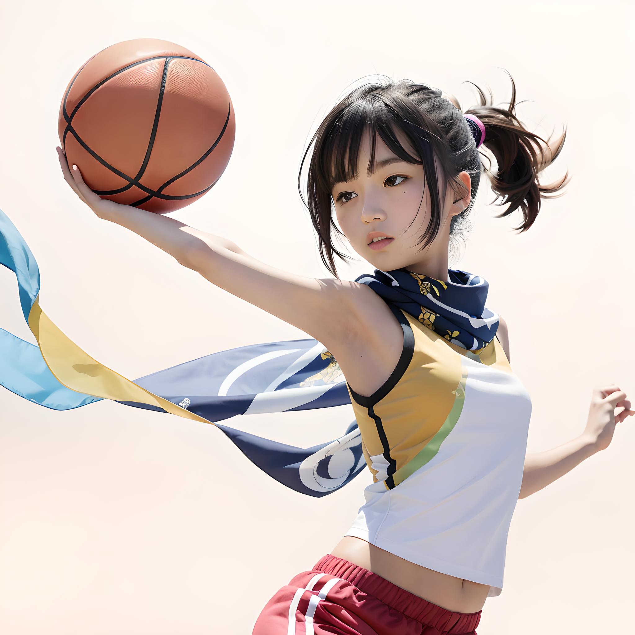 一位打篮球的女孩,白描,轻盈,丝巾图案,平面,(杰作,顶级品质,极品,官方艺术,美丽和审美:1.2),(许多颜色)